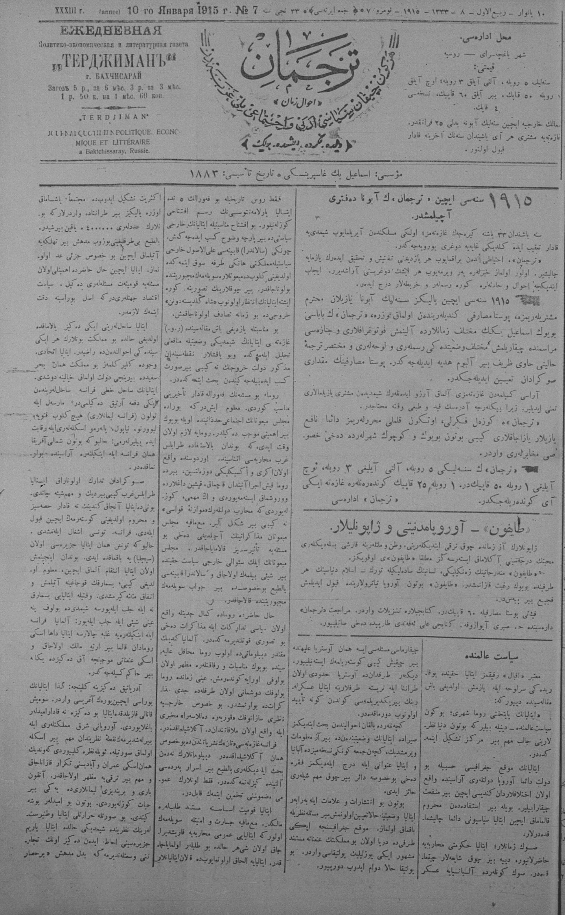 Tercüman, 10 January 1915 Year 33 No 7