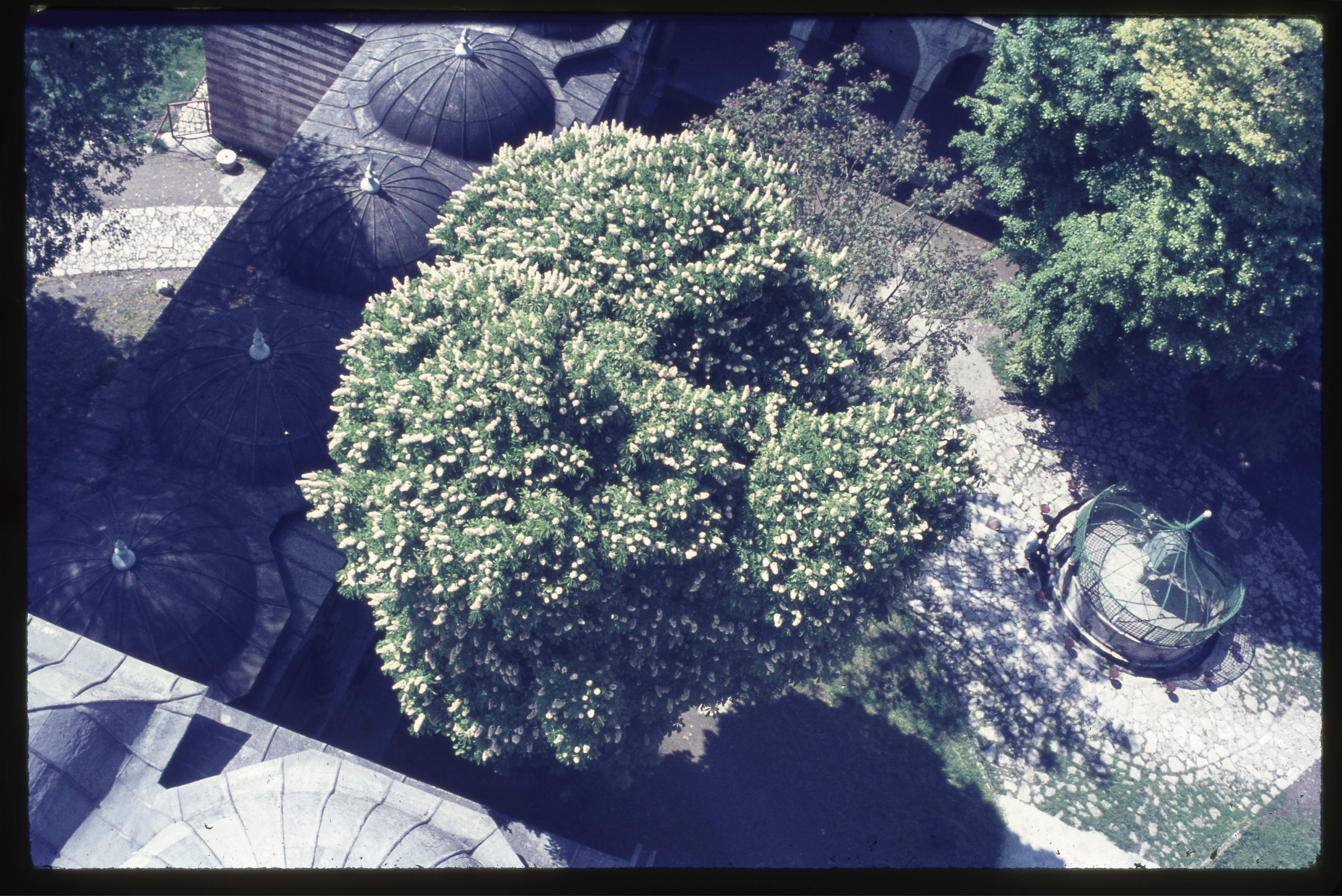 İstanbul-Topkapı'da Kara Ahmed Paşa Camii'nin minaresinden şadırvan, kubbeler ve kestane ağacının görünüşü