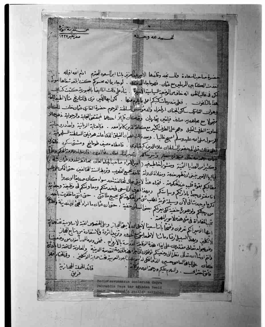 Medine savunmasının sonlarına doğru Fahreddin Paşa`nın Necid Emiri İbni Suud`a yazdığı mektup ve müsveddeleri