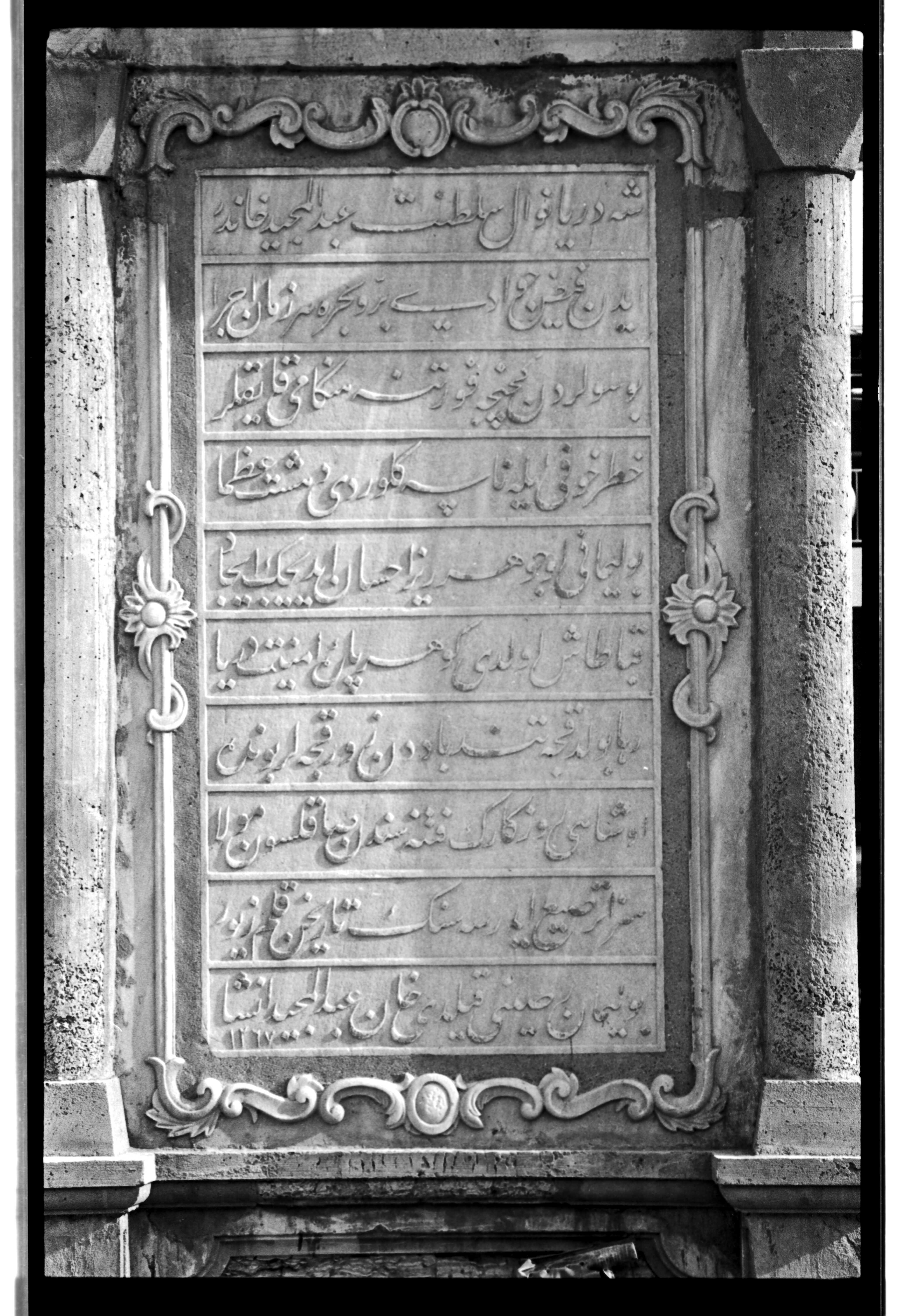Text on the inscription: Şeh-i deryâ-nevâl-i saltanat Abdülmecid Hân’dır İden feyz-i cevâdi berr ü bahre her zamân icrâ Bu sulardan geçince furtuna hengâmı kayıklar Hatar-ı havfı ile nasa gelürdü dehşet-i ‘uzmâ Bu limânı o cevher-rîz ihsân edecek icâd Kabataş oldu gevherpâre-i emniyet-i derya Rehâ buldukça tünd-bâddan zevrâkçalar bunda O şâhı rüzgârın fitnesinden saklasın Mevlâ Sezâ tersi‘ ederse seng-i tarihin kalem-i Ziver Bu limân-ı rasîni kıldı Han Abdülmecid inşâ 1267 M. (1850-51) (https://kulturenvanteri.com/yer/hadika-tasi/#17.1/41.035668/28.994139)