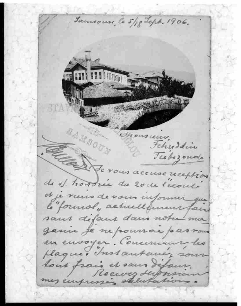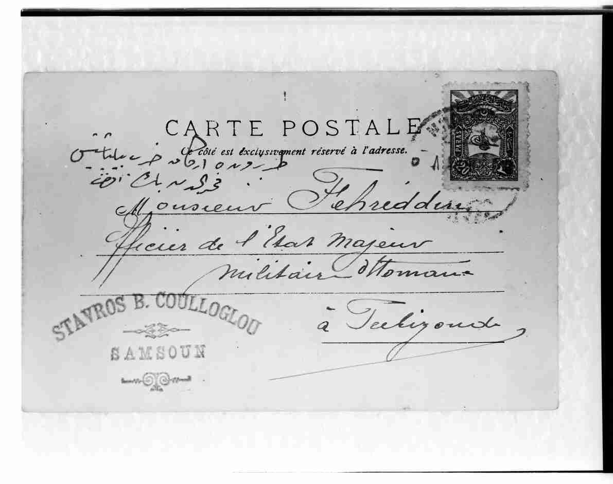 Samsun'dan fotoğrafçı Stavros B. Koloğlu'nun Trabzon`da görevli olan Binbaşı Fahreddin Bey'e gönderdiği Niksar kartpostalı