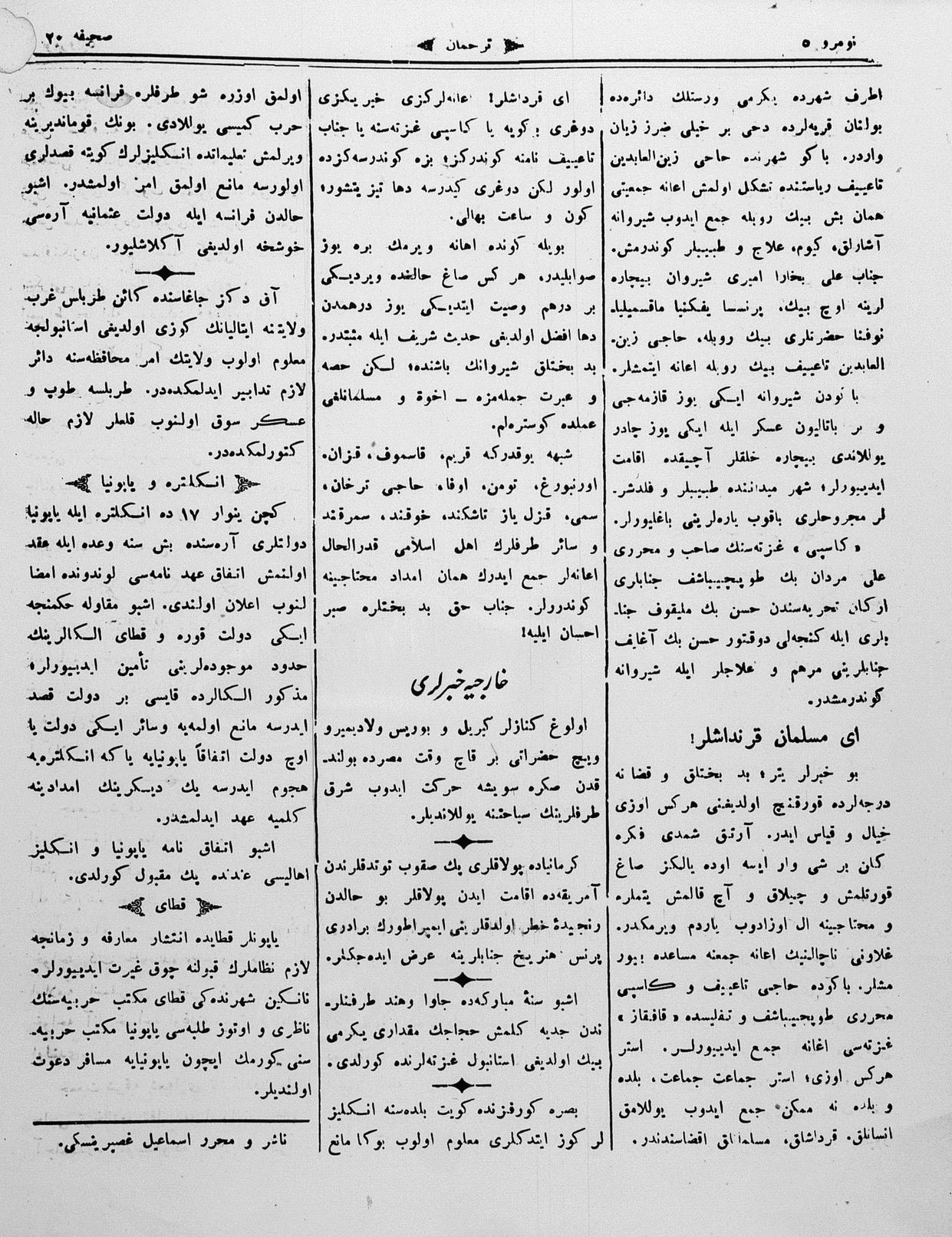 The name of the newspaper changed to Tercüman-ı Ahval-i Zaman in 1905. In 1909, it started to be published under its first name, Tercüman.