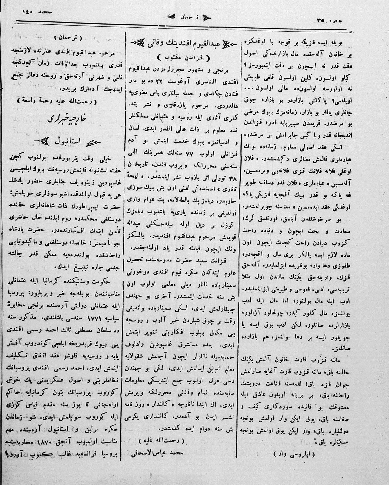 The name of the newspaper changed to Tercüman-ı Ahval-i Zaman in 1905. In 1909, it started to be published under its first name, Tercüman.