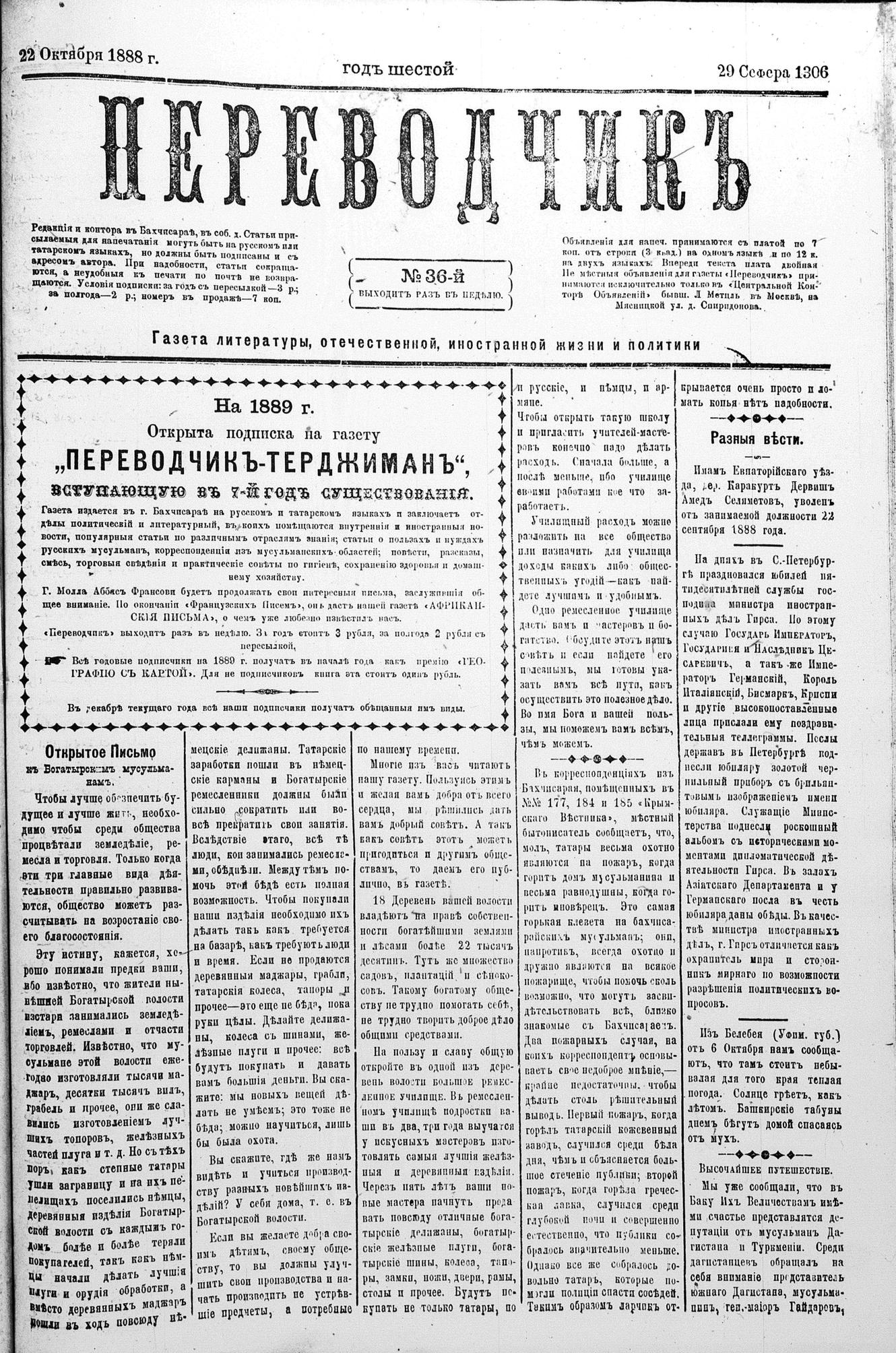 Tercüman, 22 October 1888 Year 6 No 36