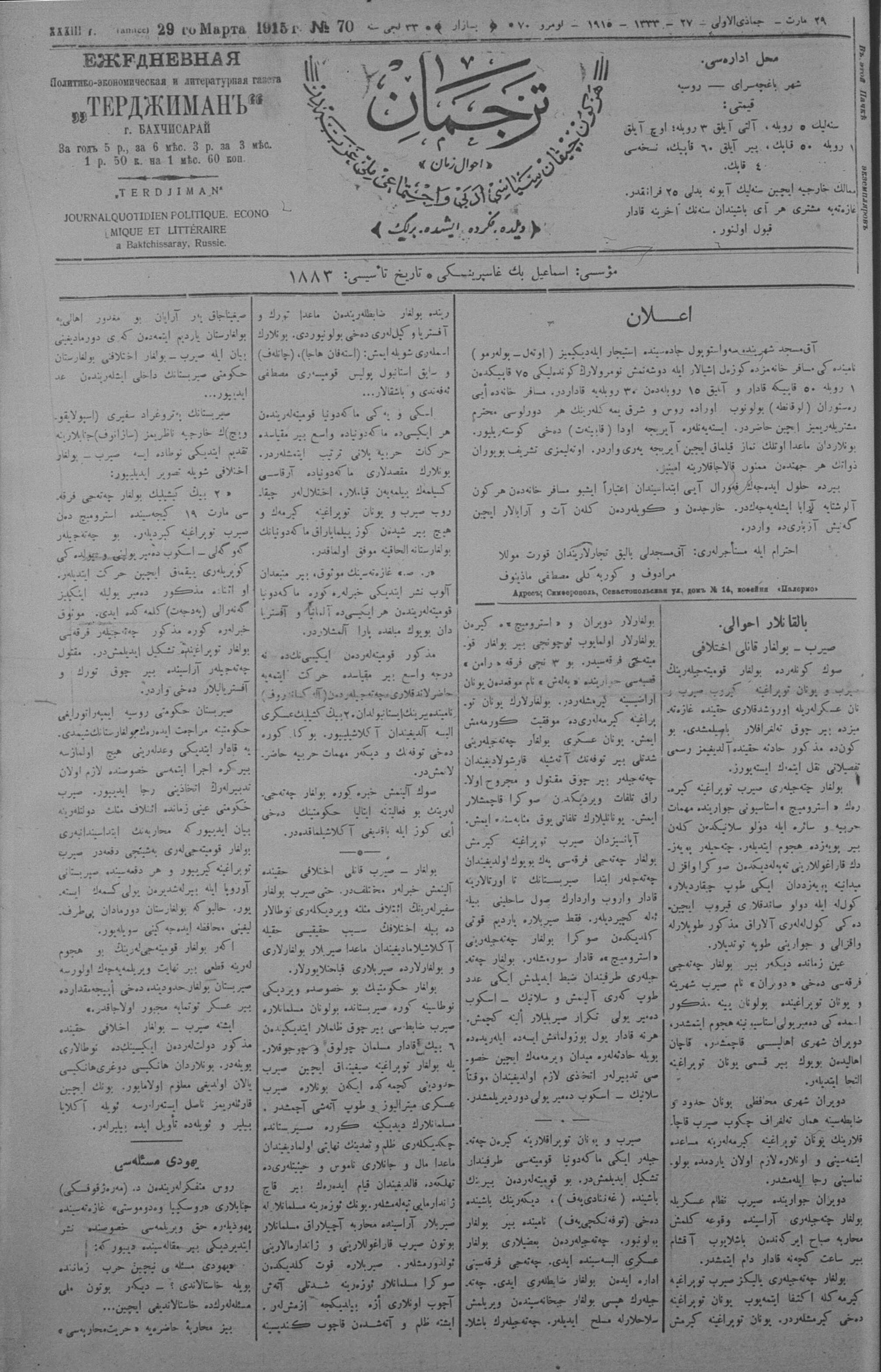 Tercüman, 29 March 1915 Year 33 No 70