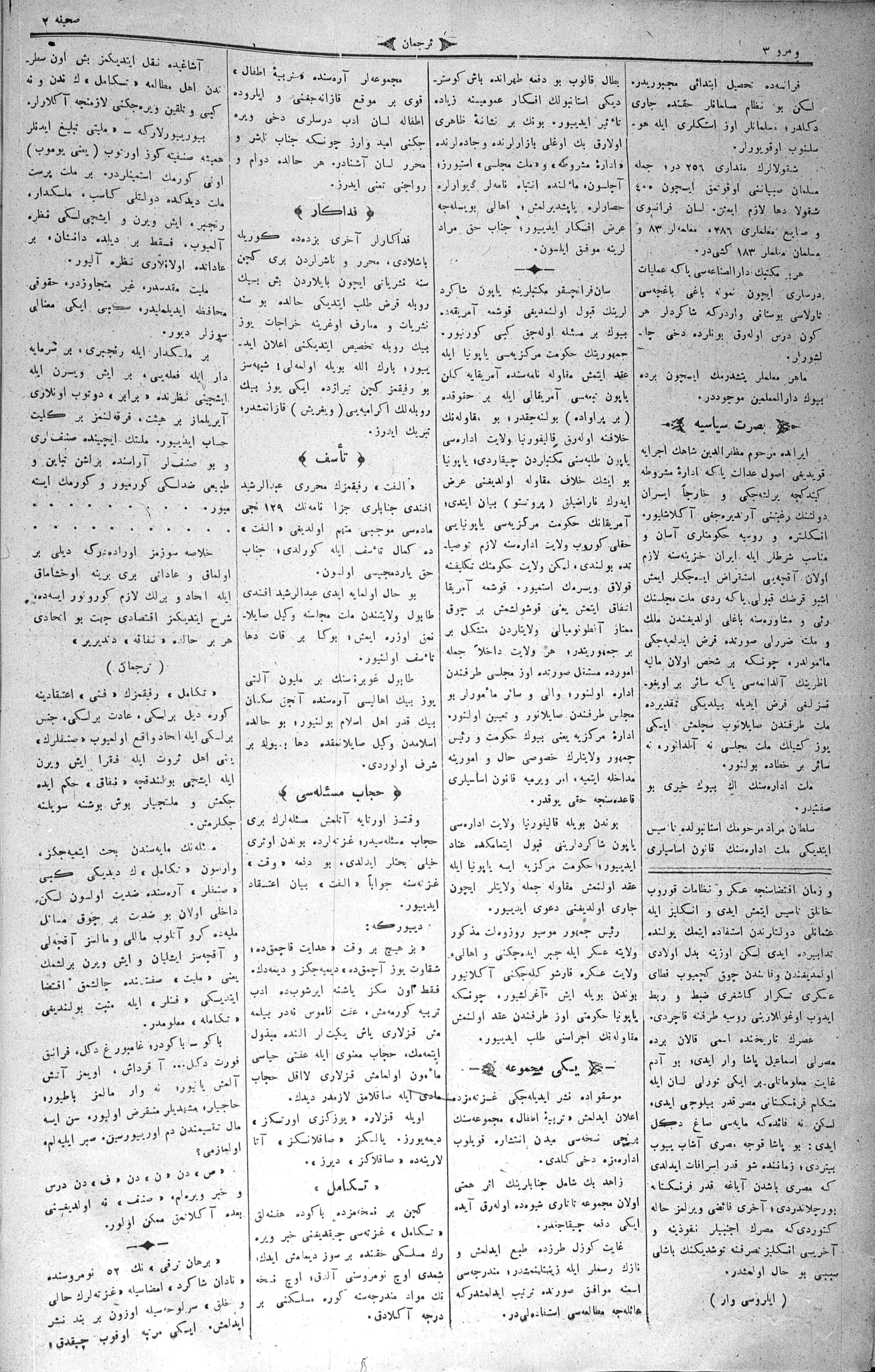 The name of the newspaper changed to Tercüman-ı Ahval-i Zaman in 1905. In 1909, it started to be published under its first name, Tercüman.