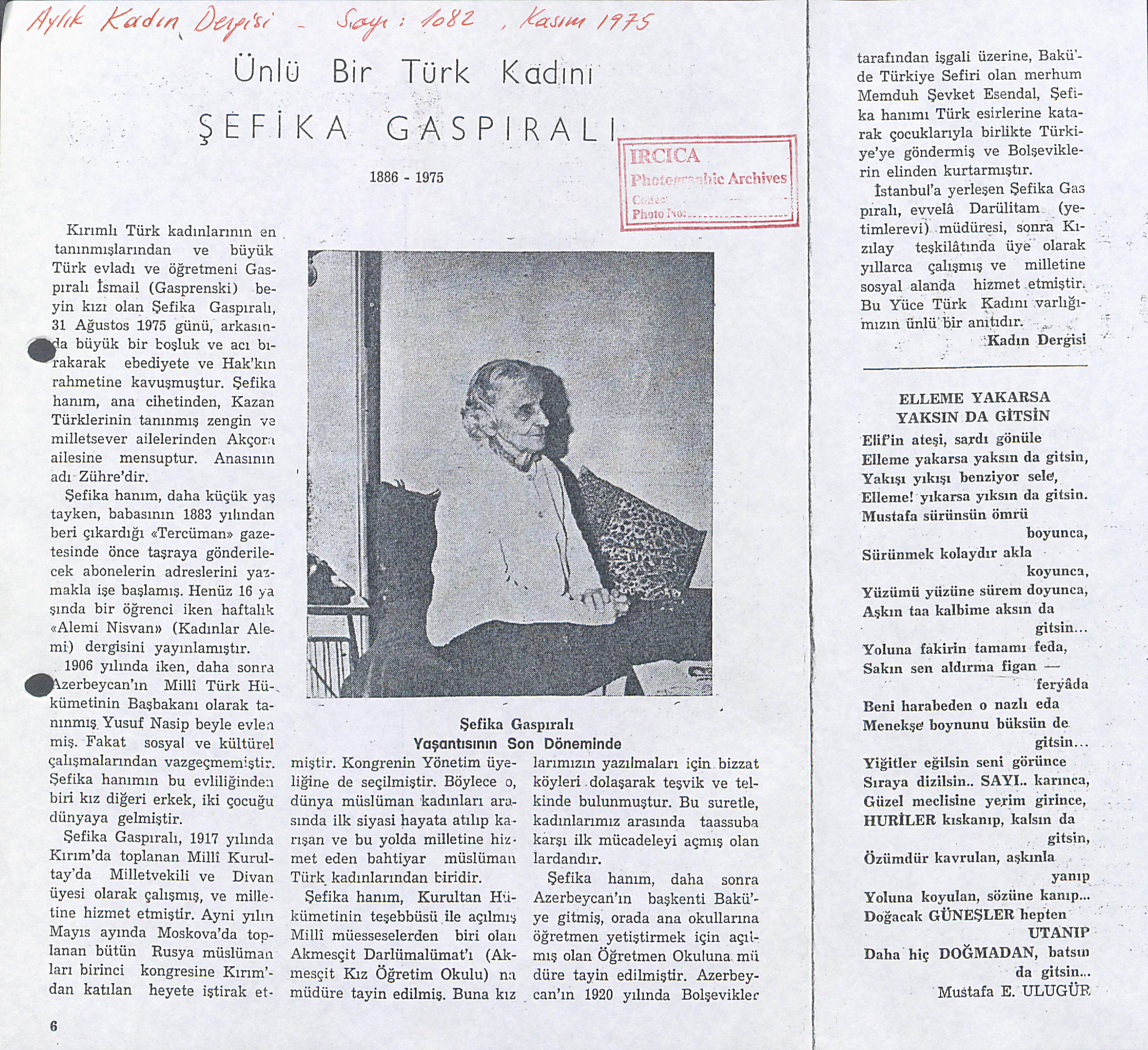 Ünlü Bir Türk Kadını Şefika Gaspıralı 1886-1975 başlıklı dergi haberi