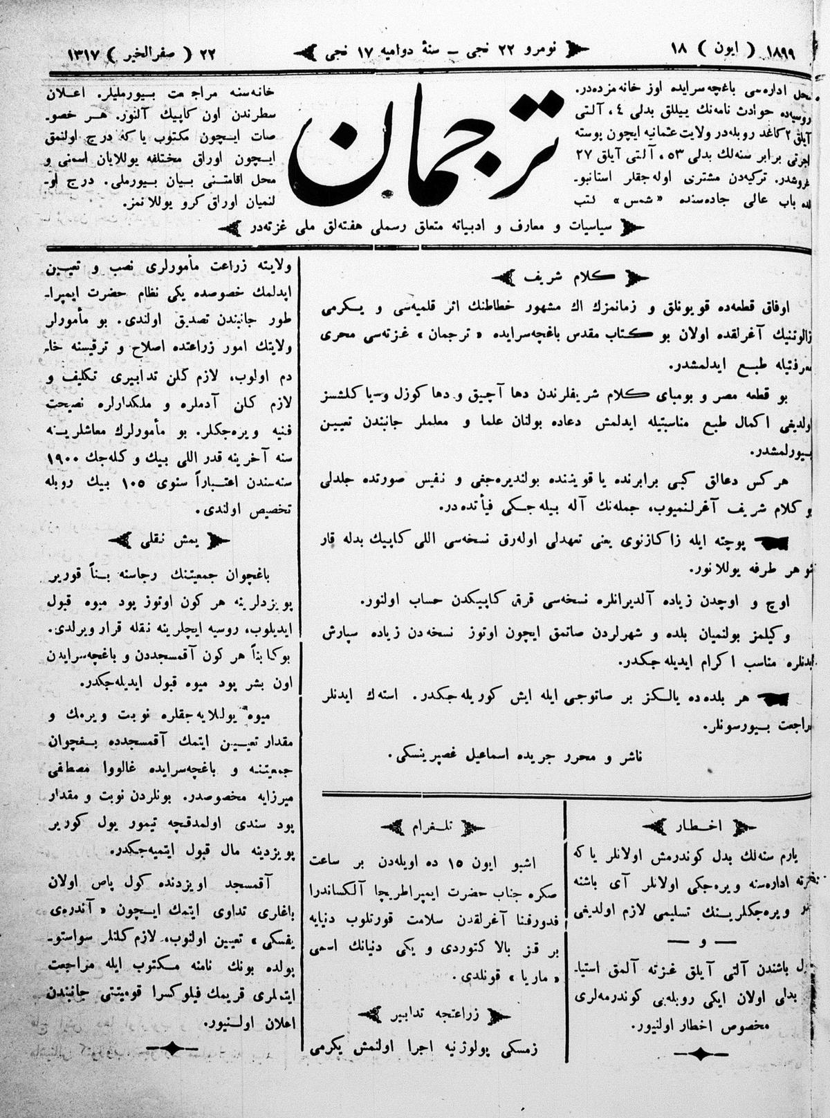 The name of the newspaper changed to Tercüman-ı Ahval-i Zaman in 1905. In 1909, it started to be published under its first name, Tercüman.