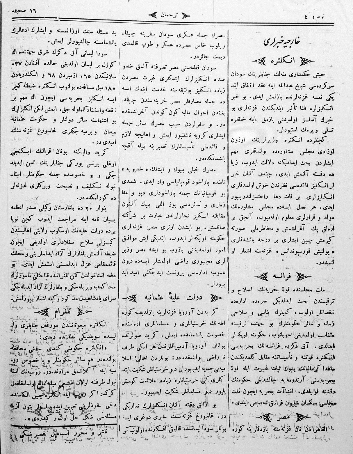The name of the newspaper changed to Tercüman-ı Ahval-i Zaman in 1905. In 1909, it started to be published under its first name, Tercüman.