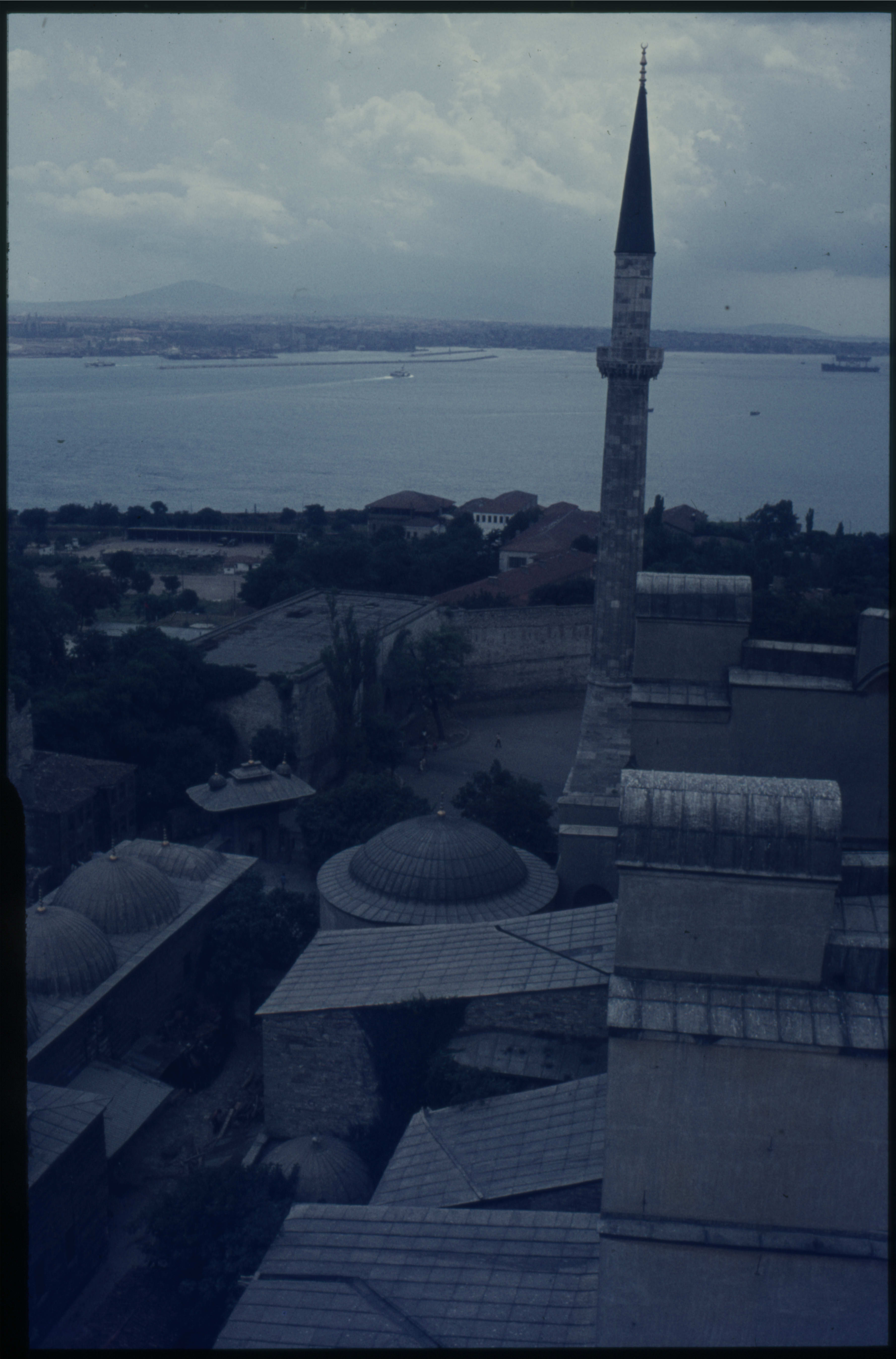 İstanbul-Ayasofya Camii'nin II. sol minaresinden Topkapı Sarayı giriş kapısı, Naziki Tekkesi ve Marmara Denizi ile karşı sahiller