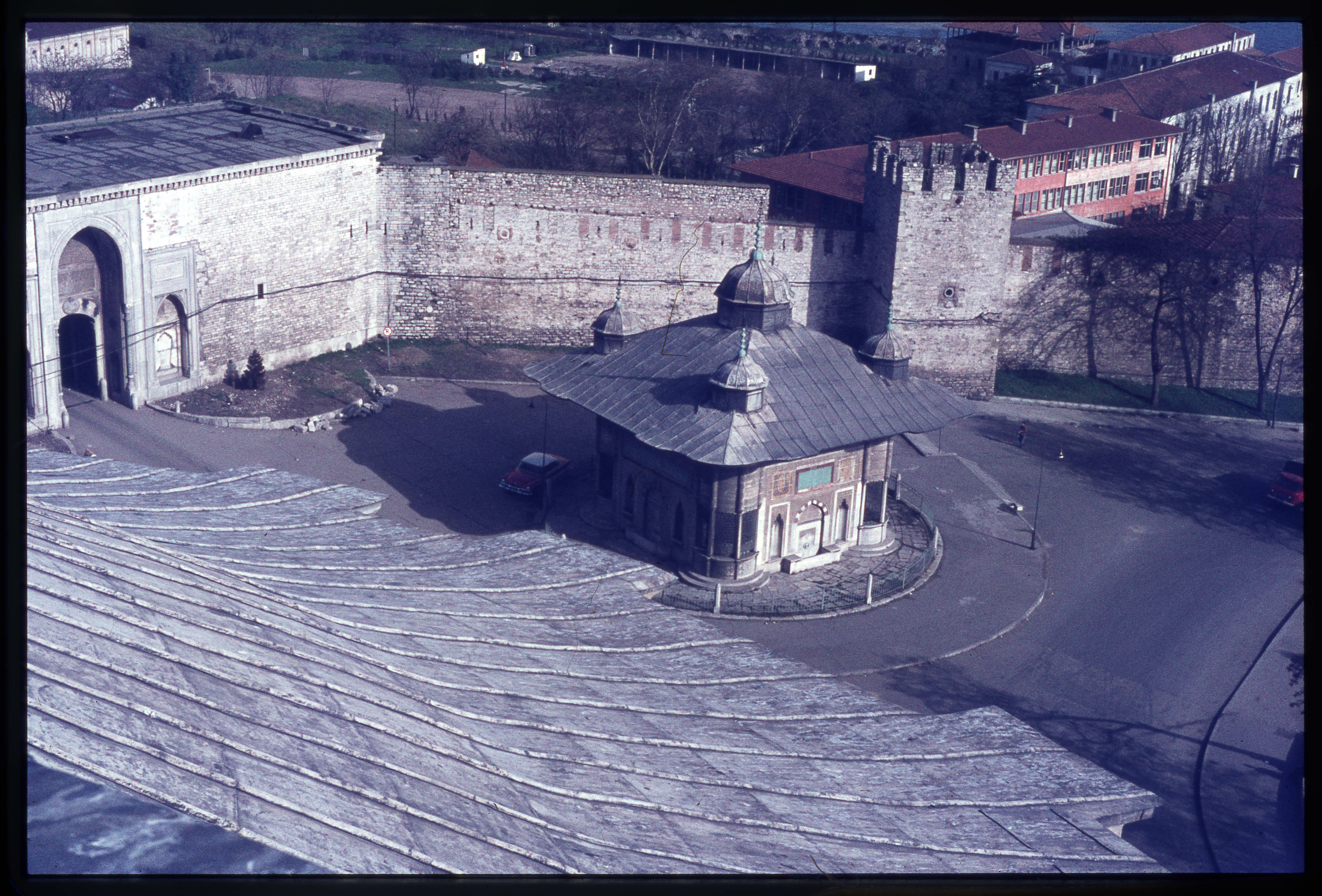 İstanbul-Ayasofya Camii'nin kubbesinden III.Ahmet Çeşmesi ve Topkapı Sarayı'nın giriş kapısı