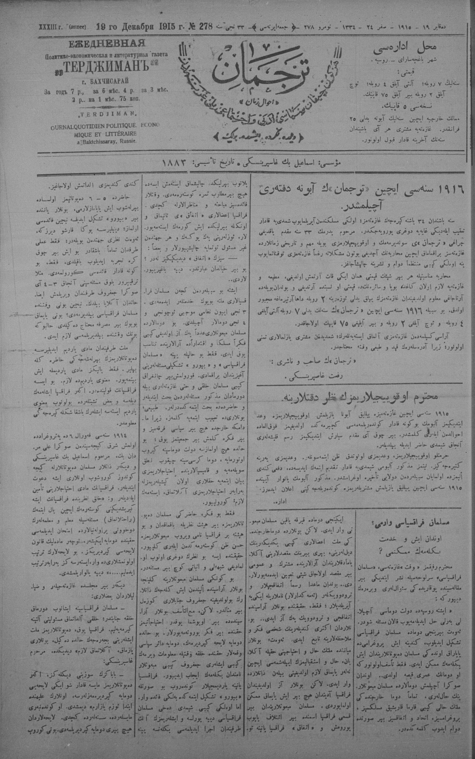Tercüman, 19 December 1915 Year 33 No 278
