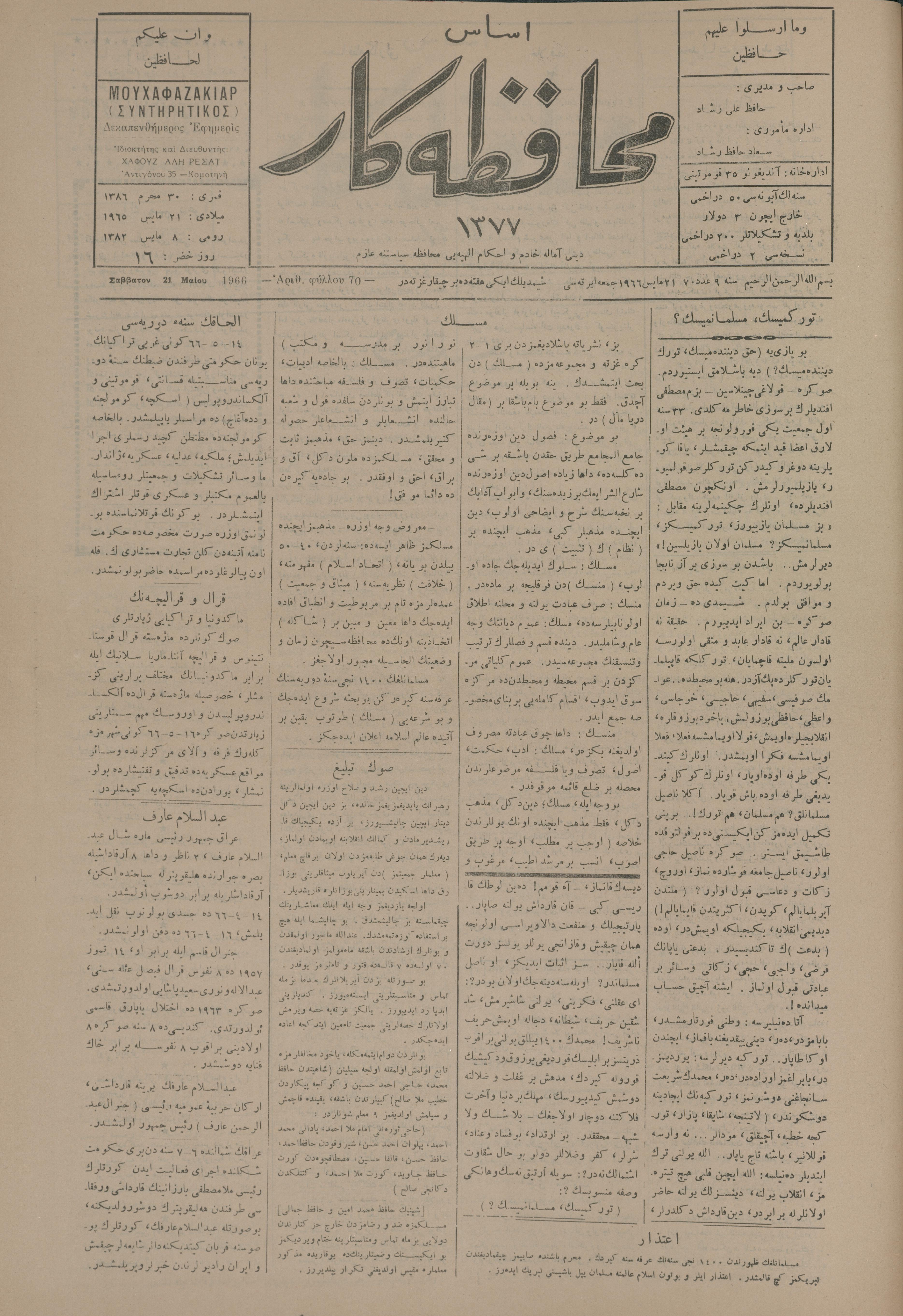 Esas muhafazakâr 1377, 21 Mayıs 1966 Sene 9 Aded 70