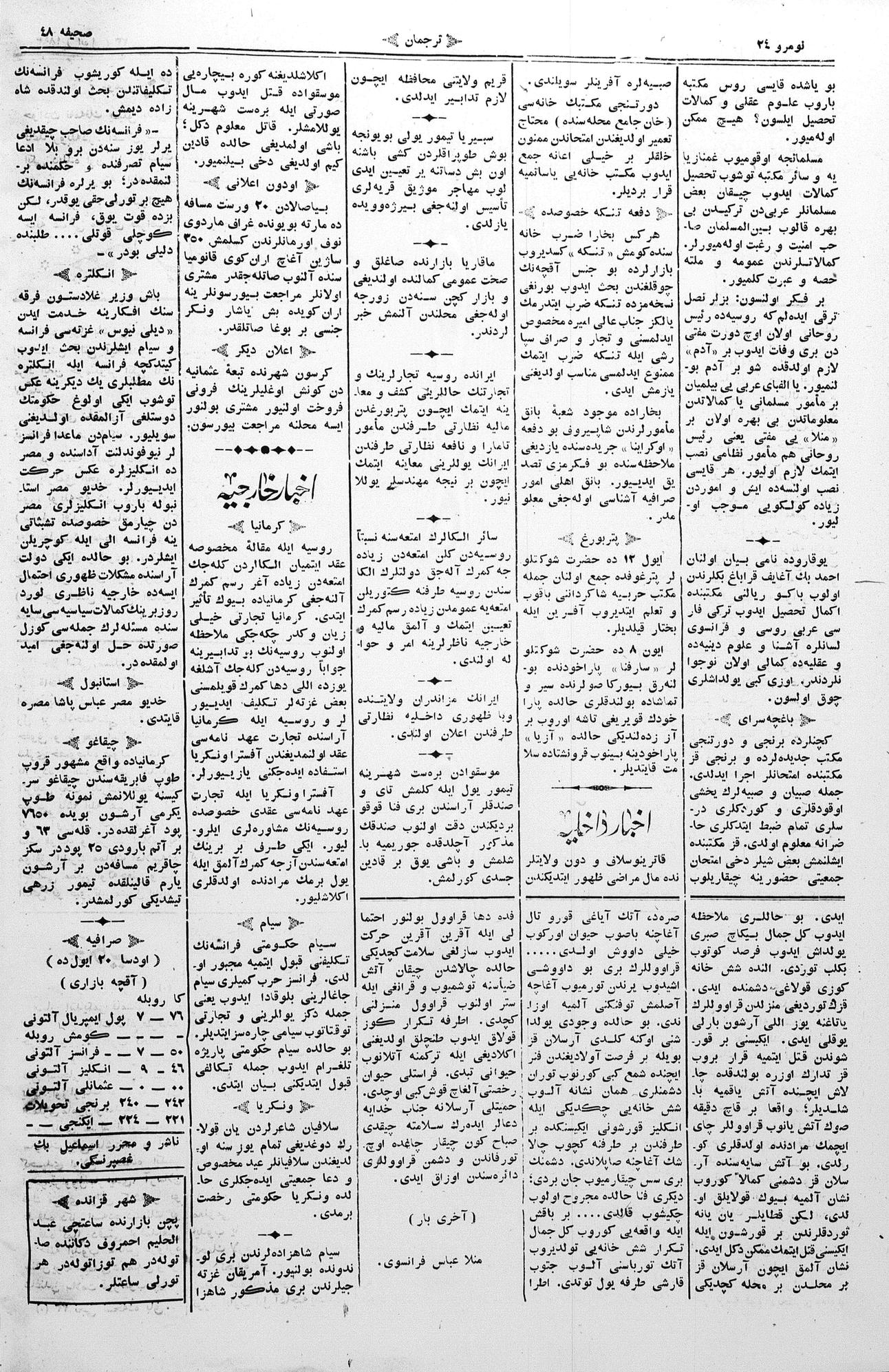 The name of the newspaper changed to Tercüman-ı Ahval-i Zaman in 1905. In 1909, it started to be published under its first name, Tercüman.