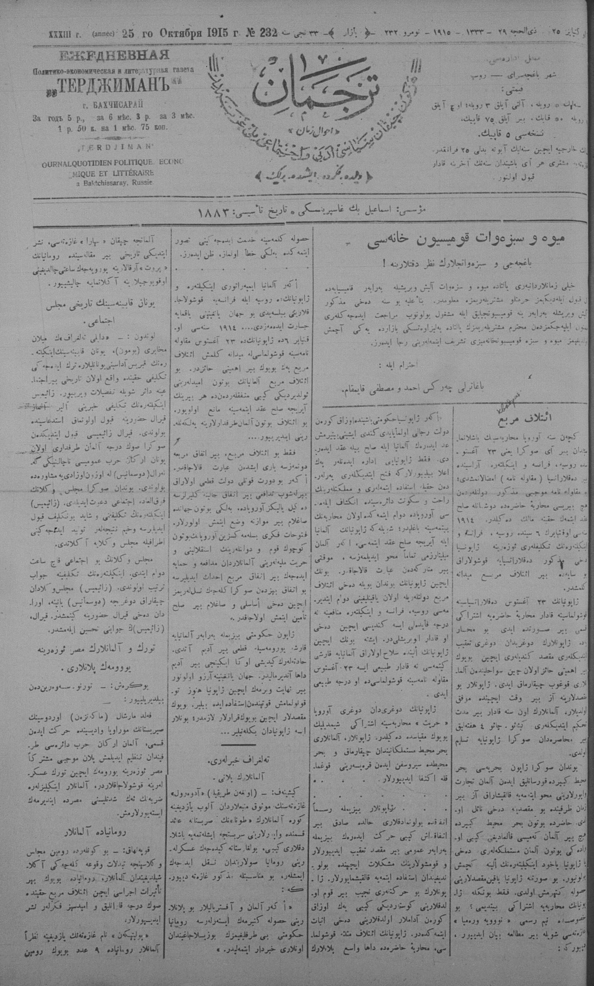 Tercüman, 25 October 1915 Year 33 No 232