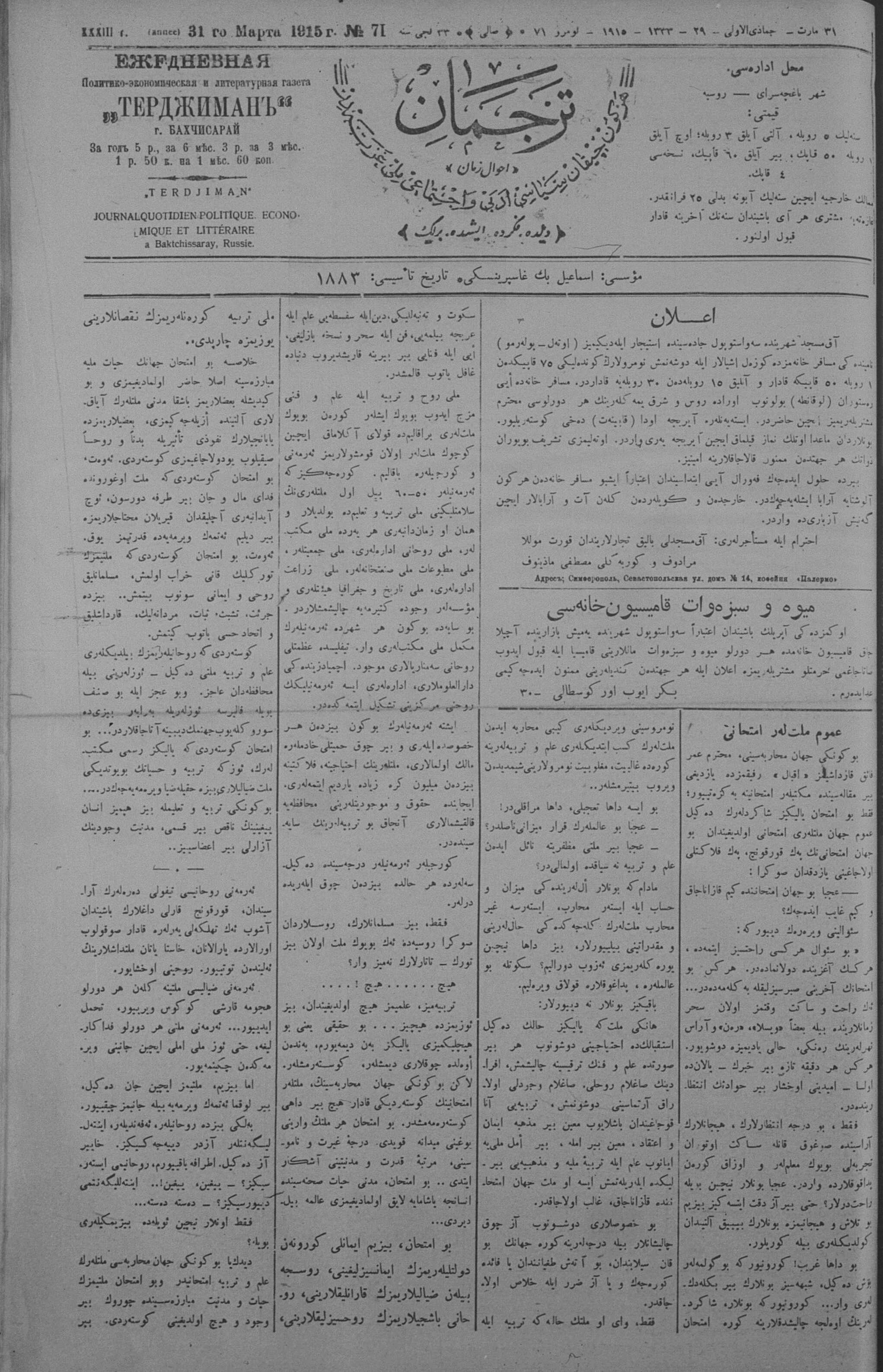 Tercüman, 31 March 1915 Year 33 No 71