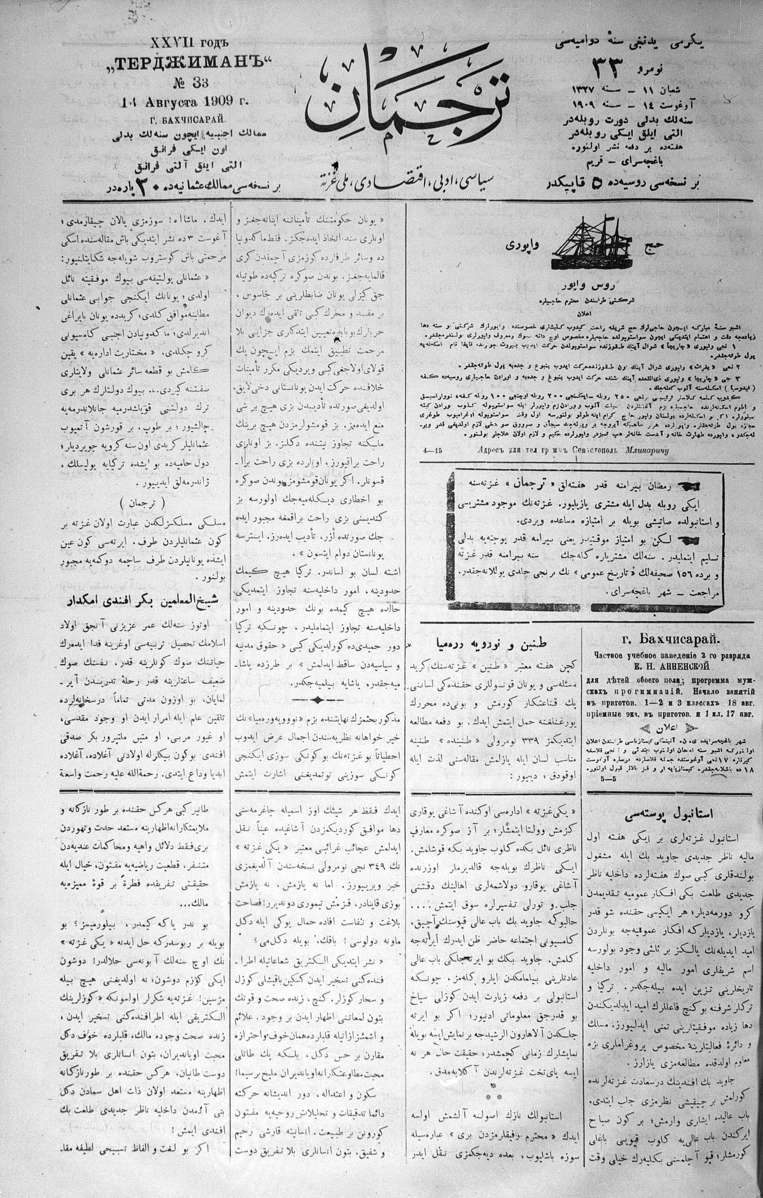 Tercüman, 14 August 1909 Year 27 No 33