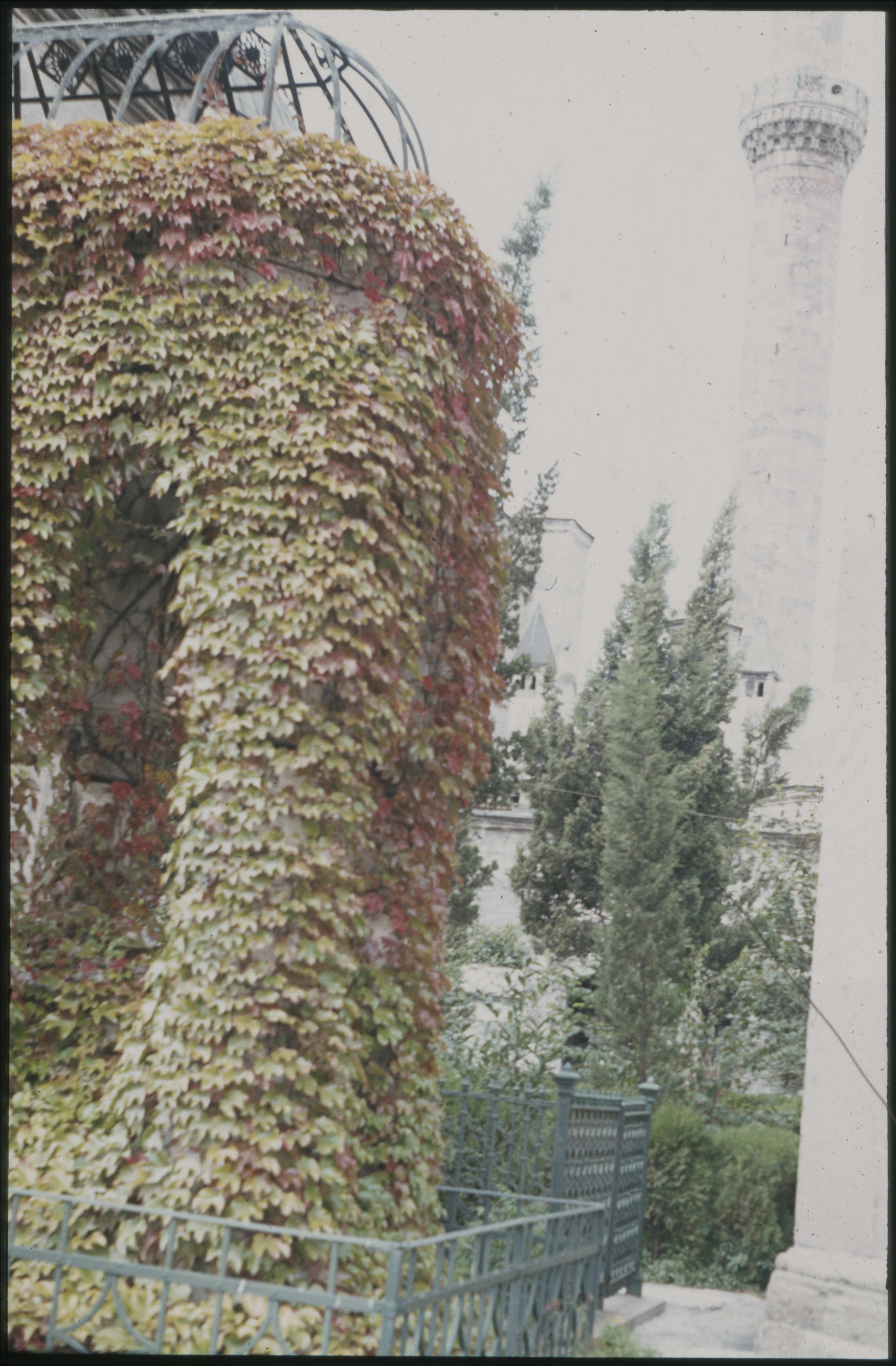 Bir camiinin haziresinde sarmaşıklar içinde bir türbe