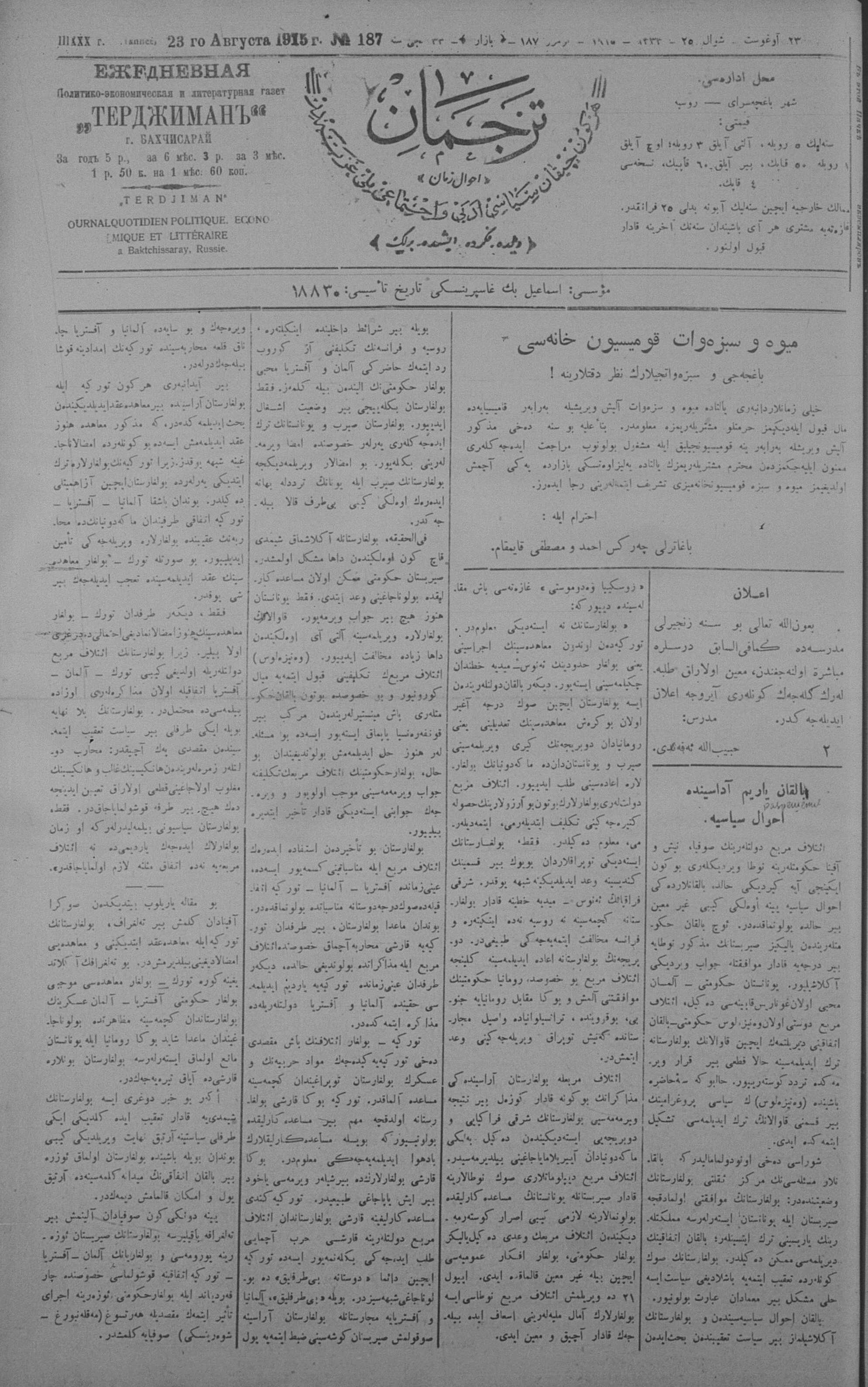 Tercüman, 23 August 1915 Year 33 No 187