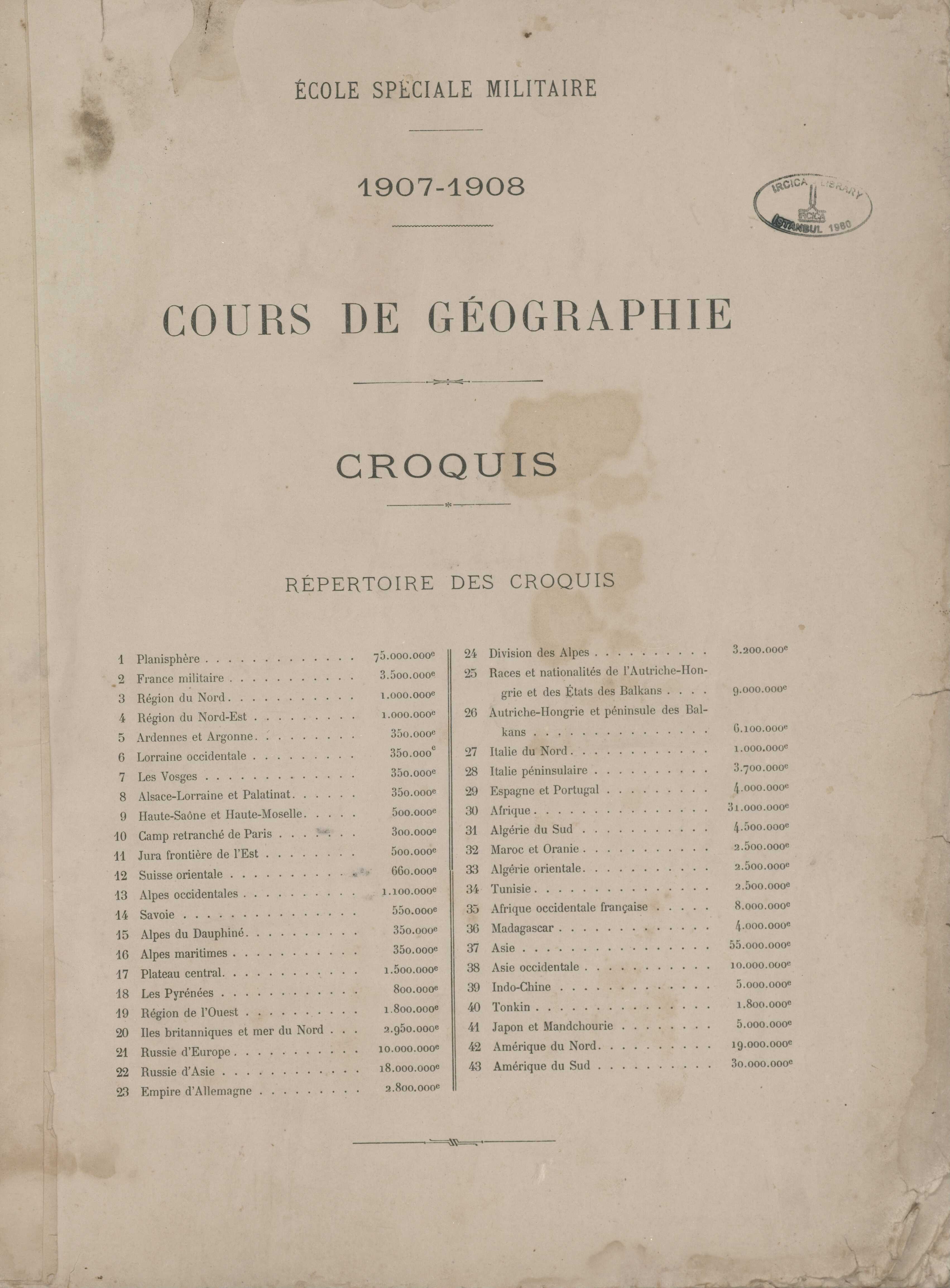 Cover title: Cours de géographie: croquis/ École Spéciale Militaire de SAINT-CYR, Année 1907–1908.