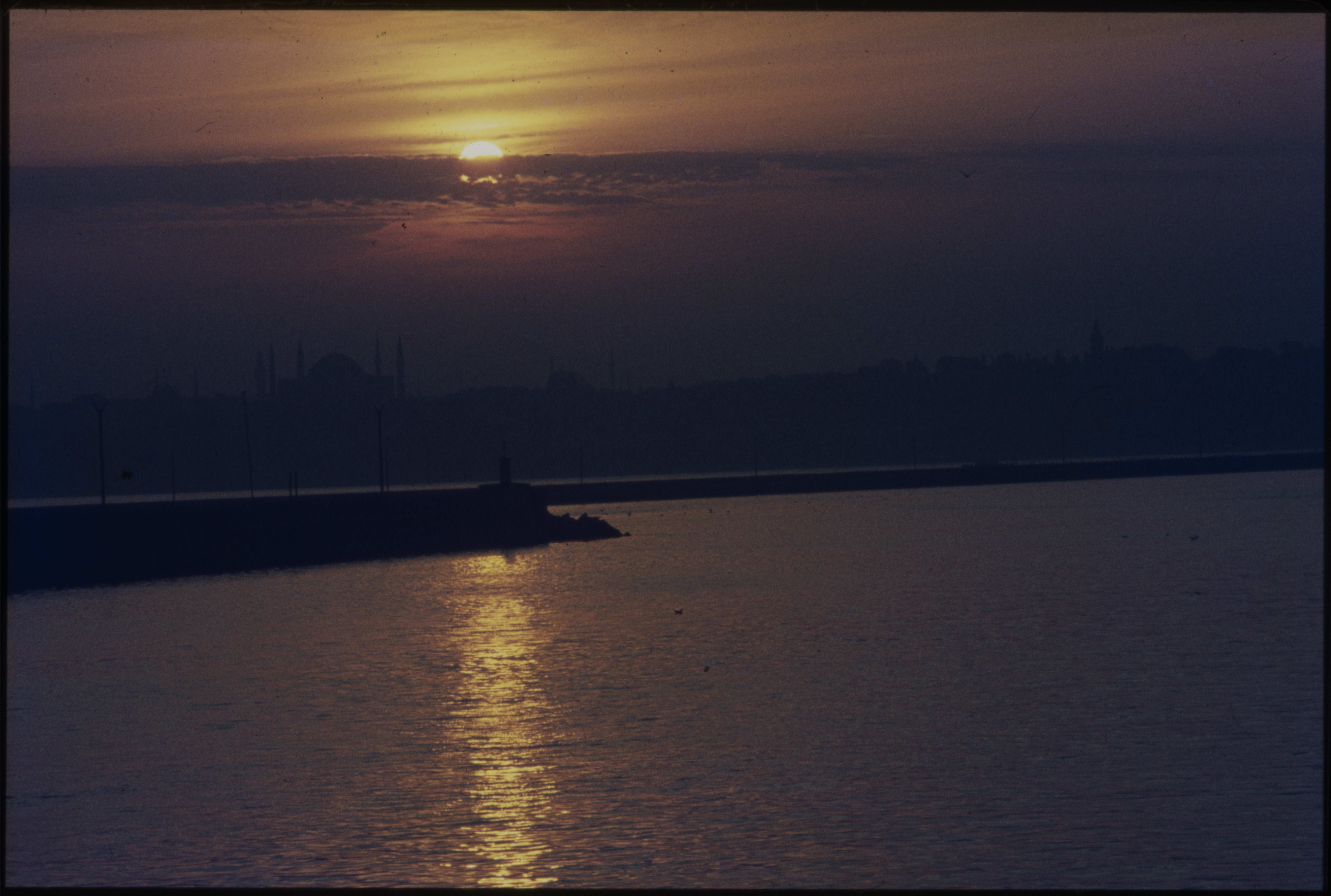 Güneş batarken Haydarpaşa'dan Ayasofya Camii ve Topkapı Sarayı'nın görünüşü