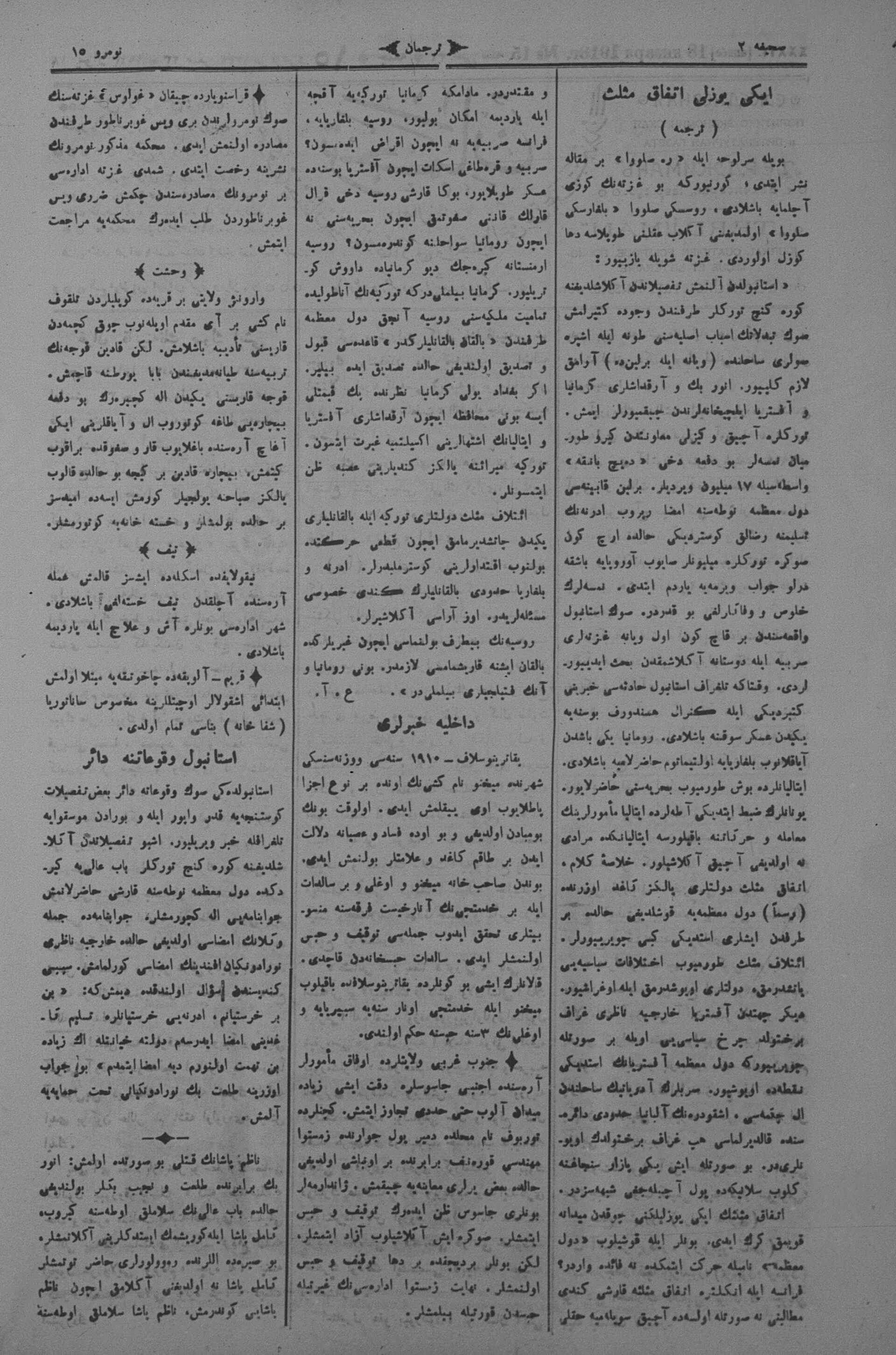The name of the newspaper changed to Tercüman-ı Ahval-i Zaman in 1905. In 1909, it started to be published under its first name, Tercüman.