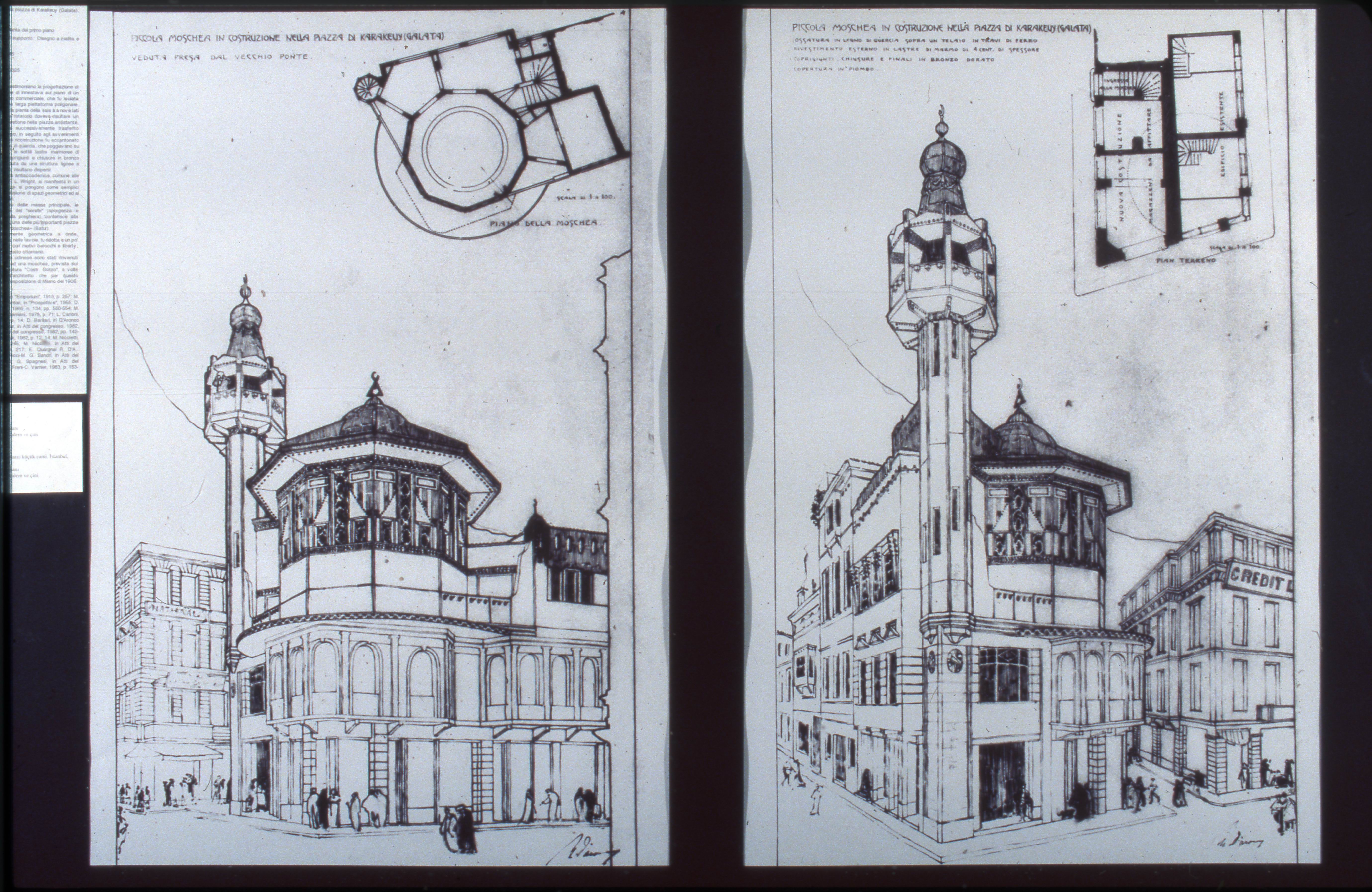 Small mosque in Karaköy Square (Merzifonlu Kara Mustafa Pasha Mosque, d. 1956) drawn by Raimondo D'Aronco