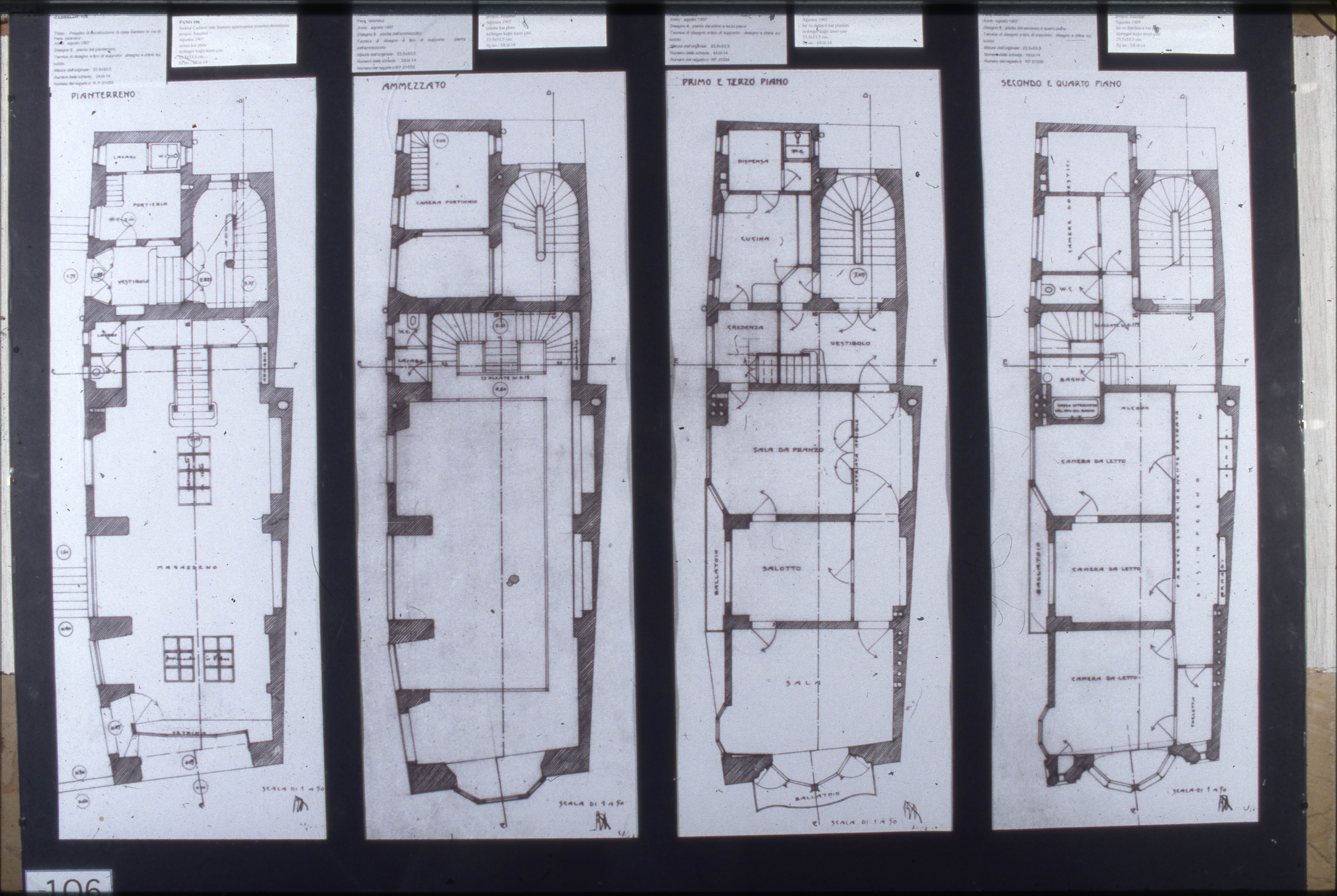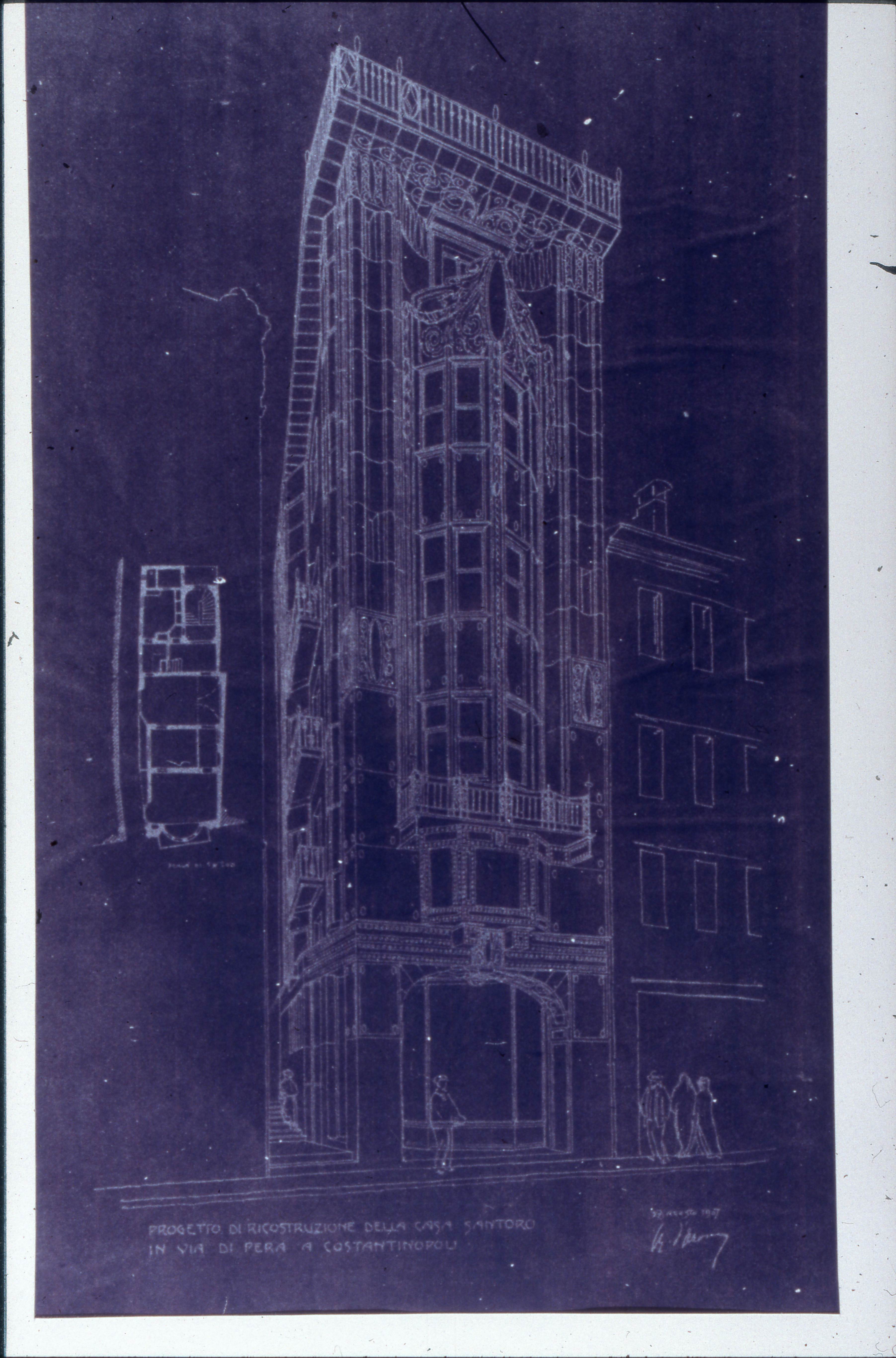 Perspective view and plans of Santoro Apartment on Istiklal Street drawn by Raimondo D'Aronco