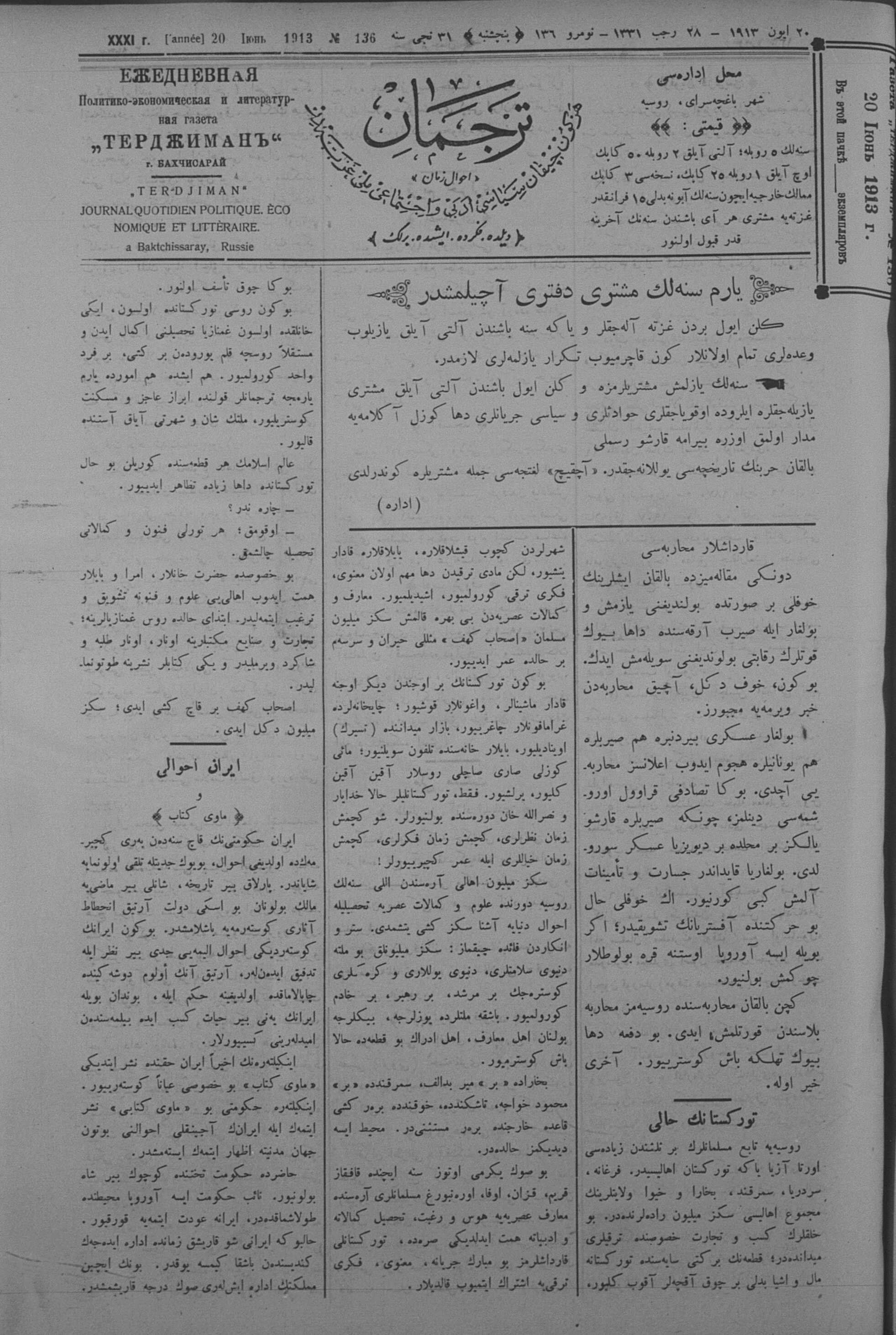 Tercüman, 20 June 1913 Year 31 No 136
