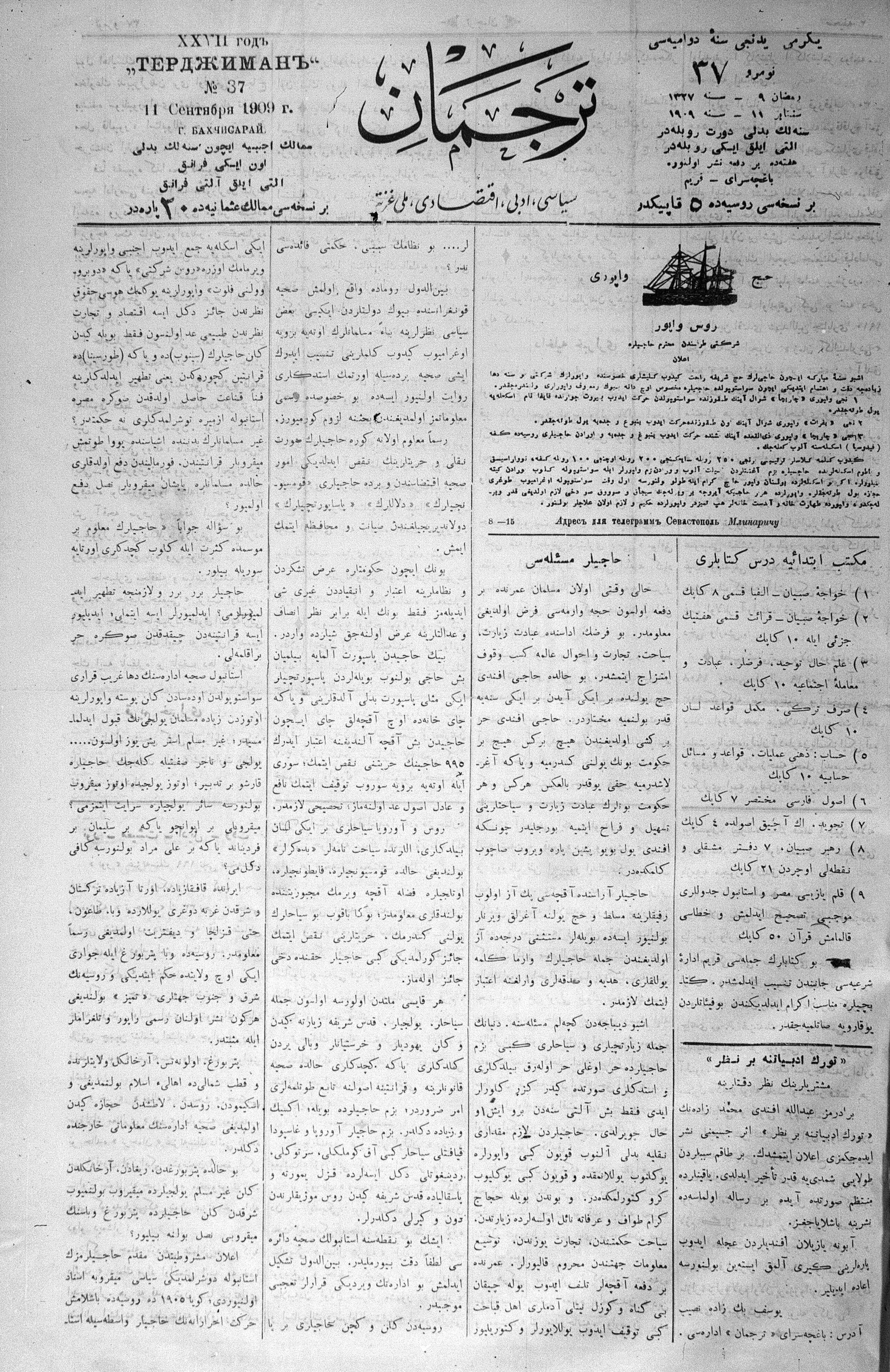 Tercüman, 11 September 1909 Year 27 No 37