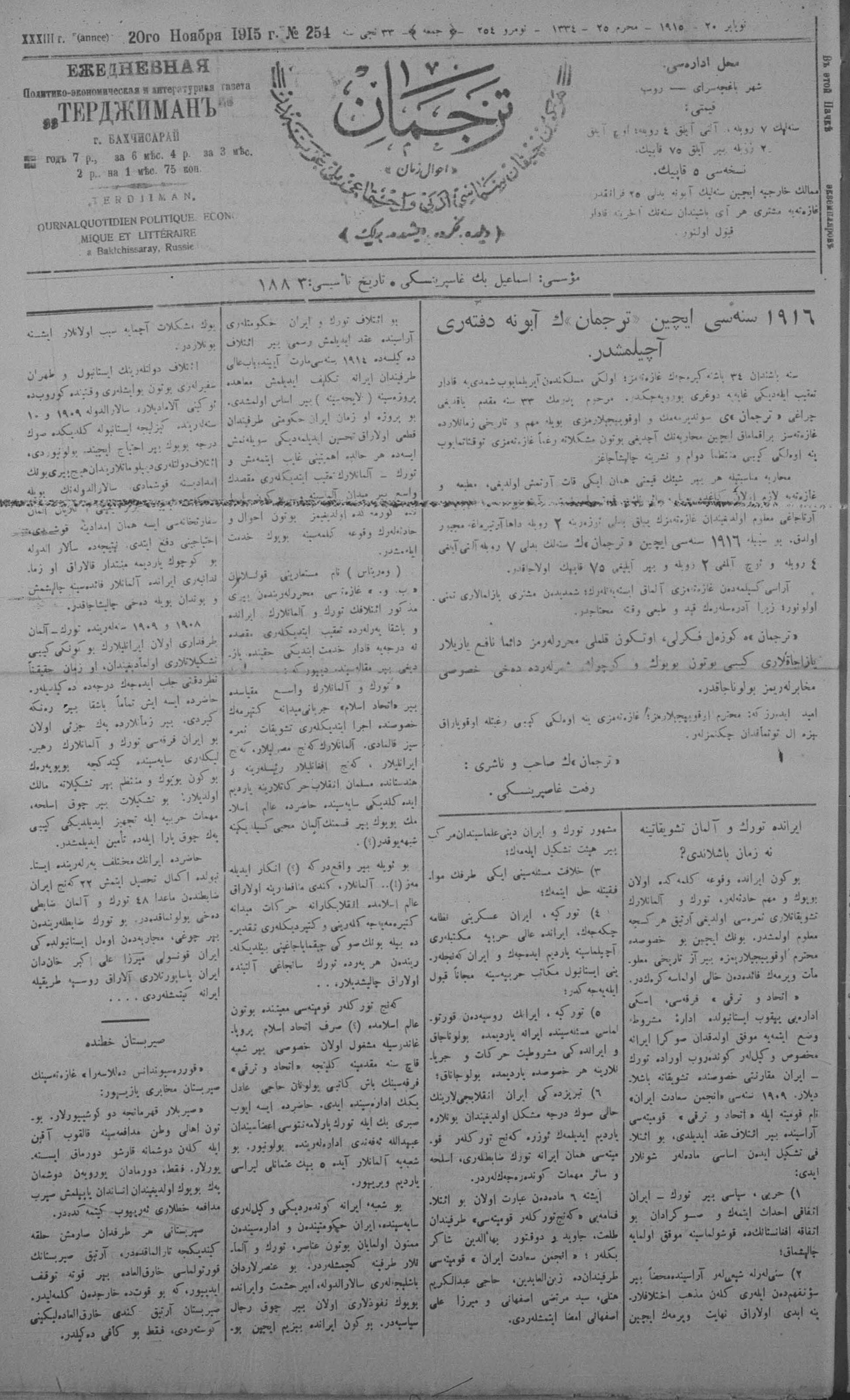 Tercüman, 20 November 1915 Year 33 No 254