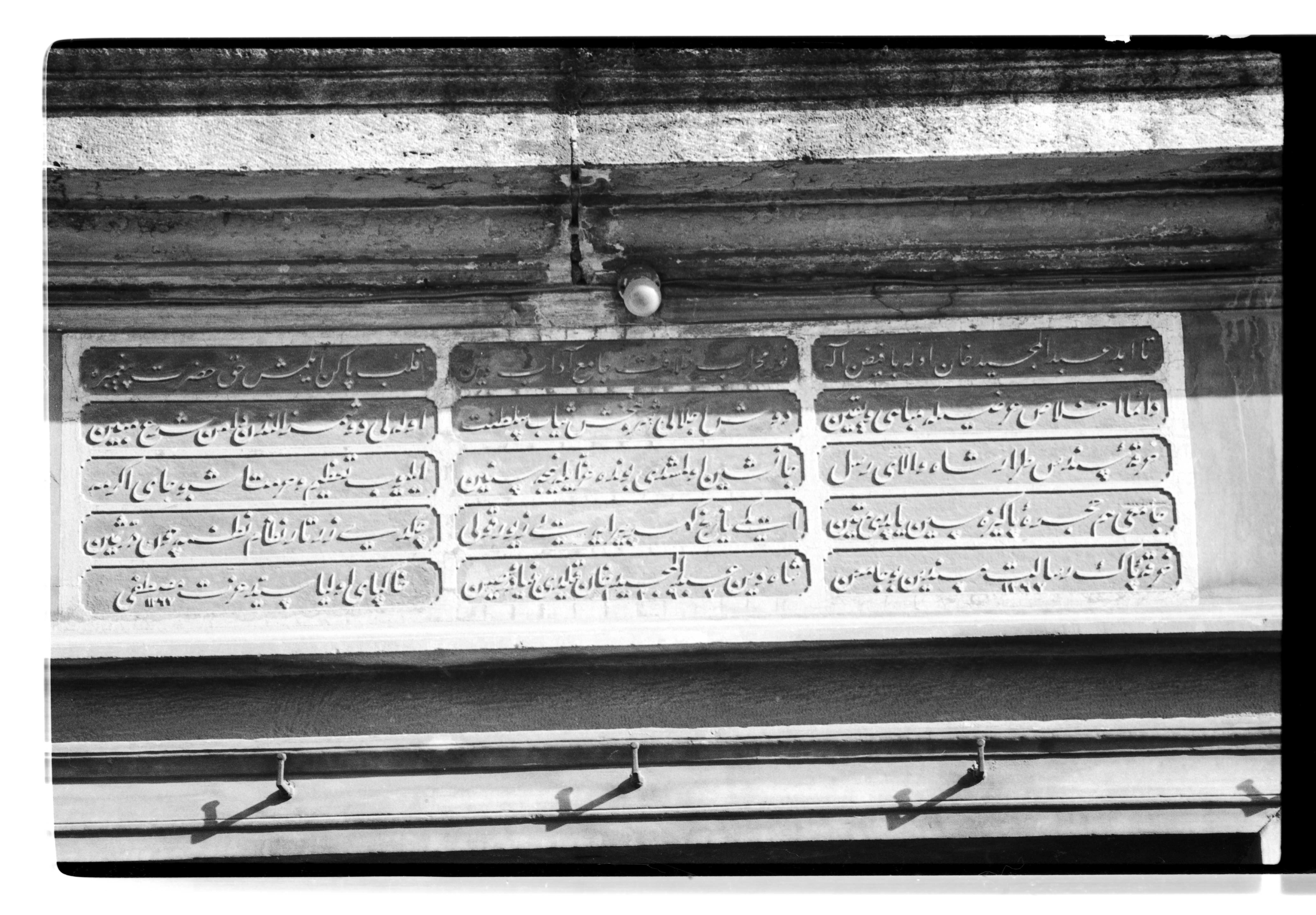 Text on the inscription: Tā ebed ʿAbdülmecīd Ḫān ola bā feyż-i İlāh Nūr-ı miḥrāb-ı ḫilāfet cāmiʿ-i ādāb-ı dīn Ḳalb-i pākin eylemiş Ḥaḳ Ḥażret-i peyġambere Dāʾimā iḫlāṣ ʿarżiyla mebāhī vü yaḳīn Dūş-ı iclāli şeref-baḫş-ı s̱iyāb-ı salṭanat Olalı düşmez elinden dāmen-i şerʿ-i mübīn Ḥırḳa-i sündüs-i ṭarrār şāh-ı vālā-yı rusül Cā-nişīn olmuşdu bunda ʿizz ile nice sinīn Eyleyip taʿẓīm ü ḥürmet işbu cā-yı ekreme Cāmiʿ hem hücre-i pākīzesin yapdı metīn İki tārīḫ-i güher-pīrāyeyi Zīver ḳulu Çekdi zer-tār-ı niẓām-ı naẓma çün dürr-i sīmīn Ḫırḳa-i pākiŋ risālet-mesnedin bu cāmiʿin Şāh-ı dīn ʿAbdülmecīd Ḫān ḳıldı bünyād ü raṣīn Ḫāk-pā-yı evliyā Seyyid ʿİzzet Muṣṭafā 1267 (http://www.ottomaninscriptions.com/verse.aspx?ref=list&bid=2070&hid=2740)