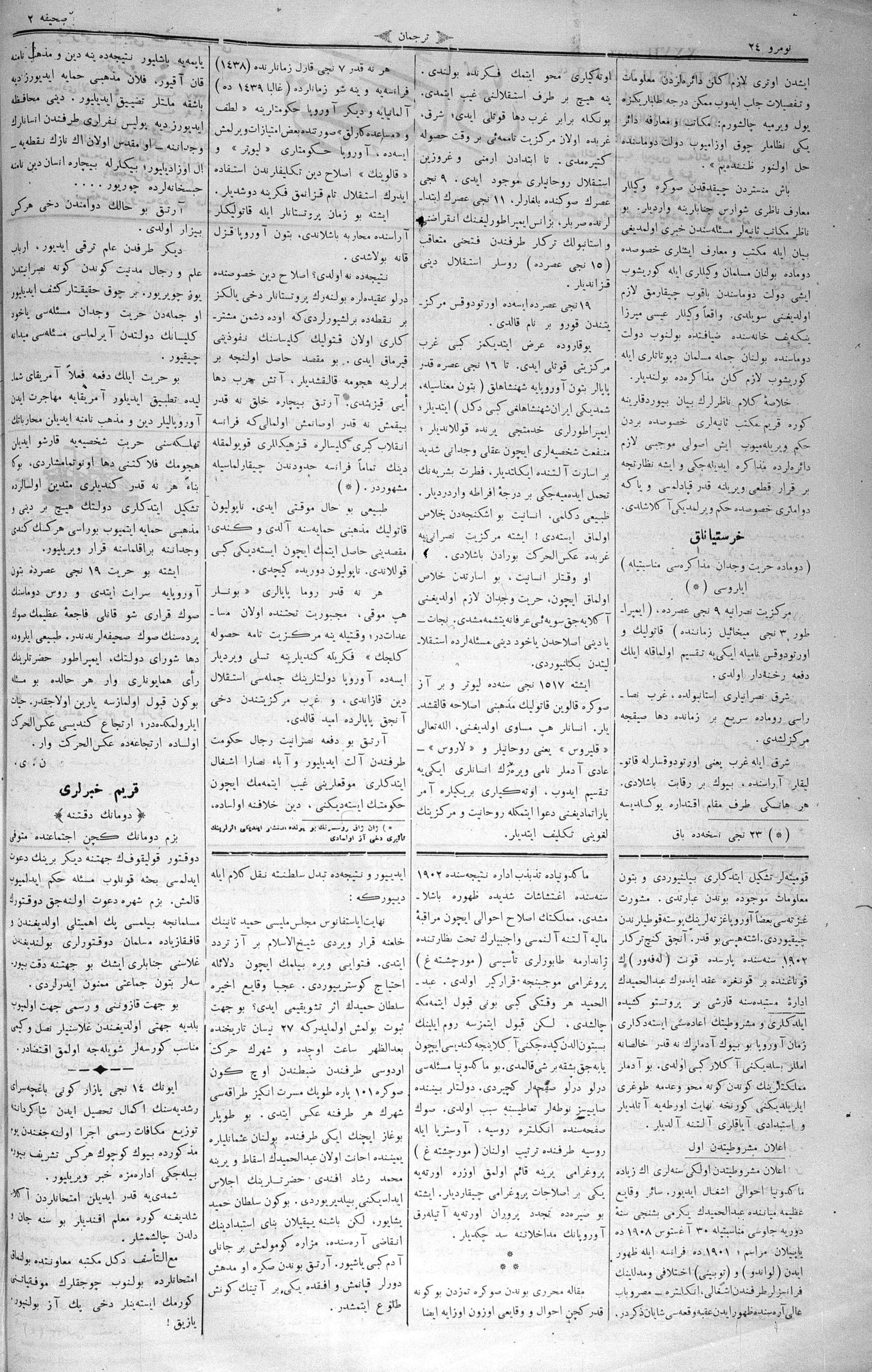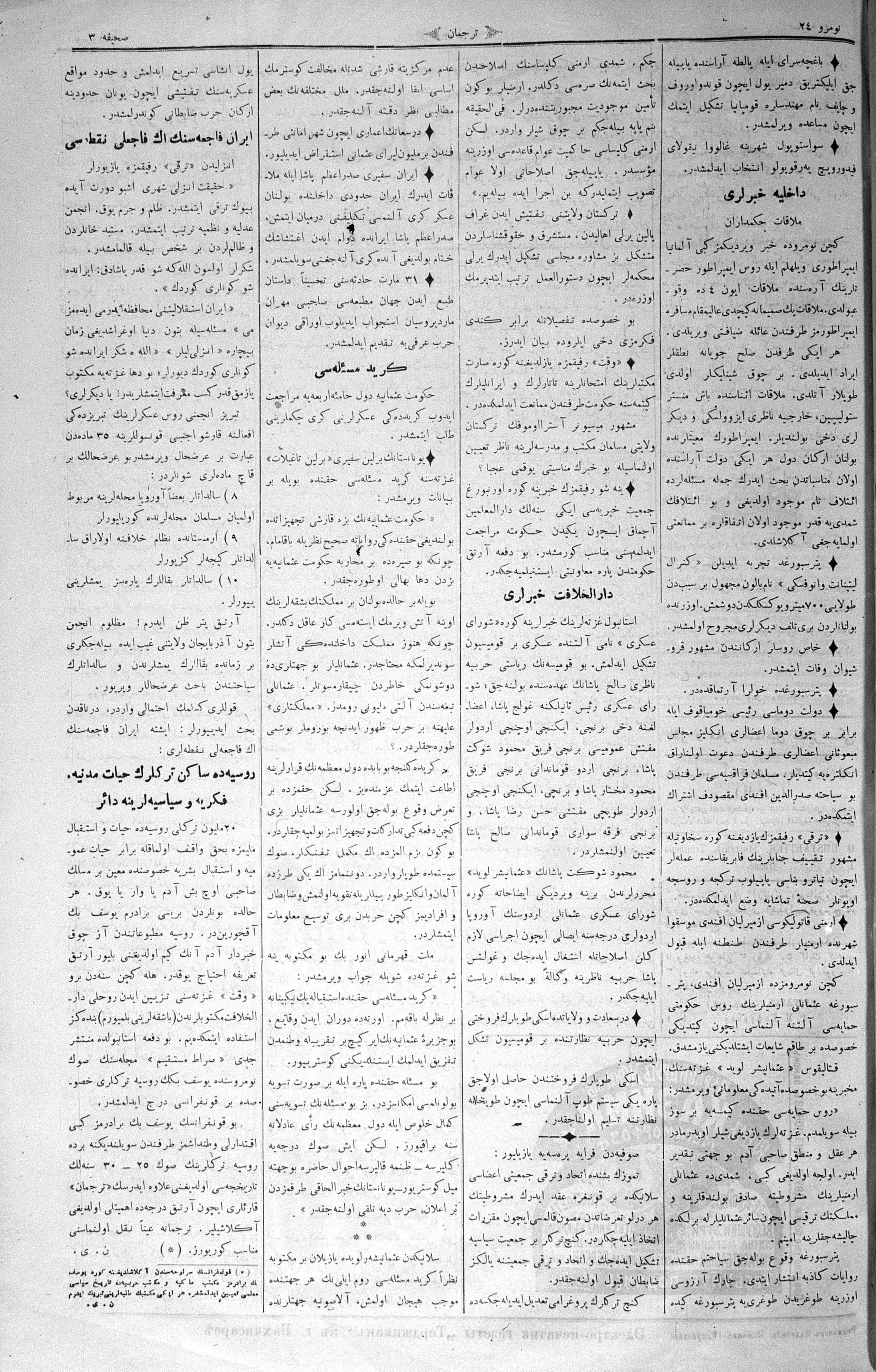 The name of the newspaper changed to Tercüman-ı Ahval-i Zaman in 1905. In 1909, it started to be published under its first name, Tercüman.
