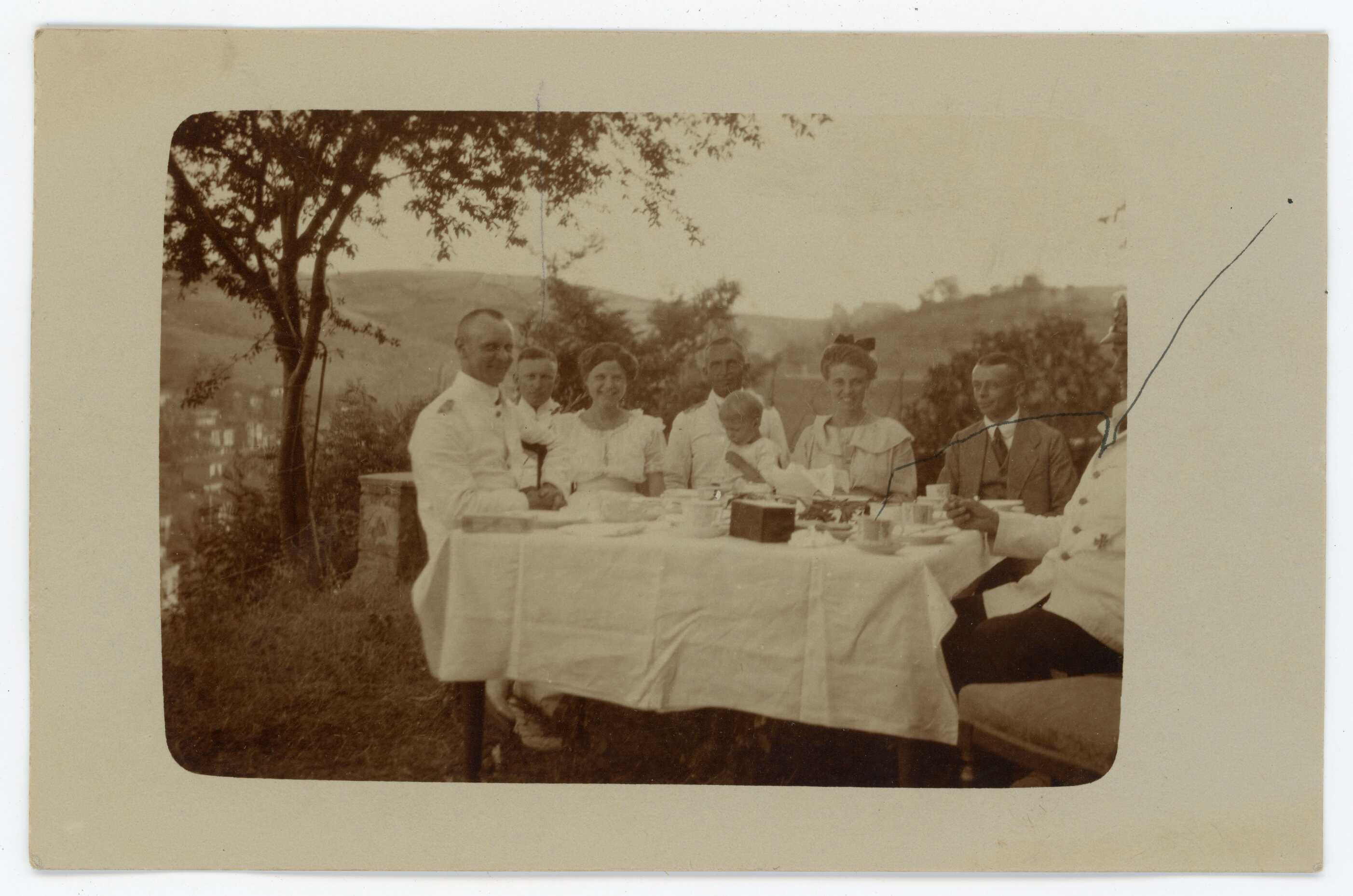 Tarabya'da Alman Subayları ve aileleri bahçede bir masa etrafında