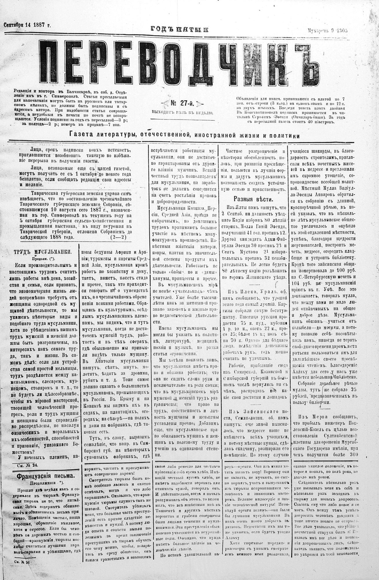Tercüman, 14 September 1887 Year 5 No 27