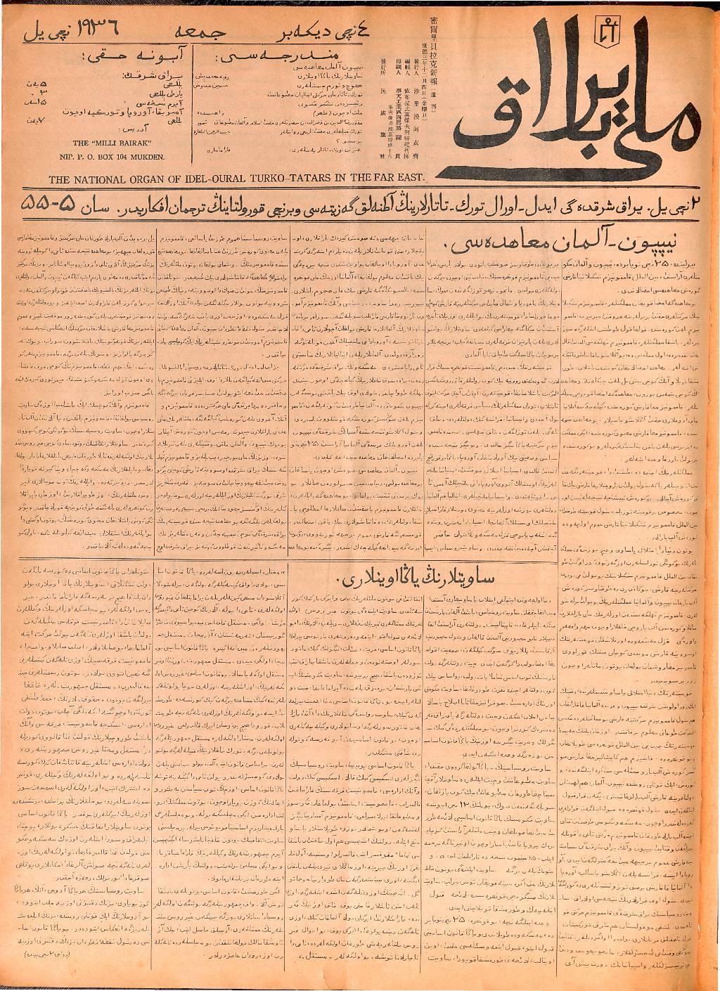 The Milli Bayrak newspaper was printed in Mukden.
