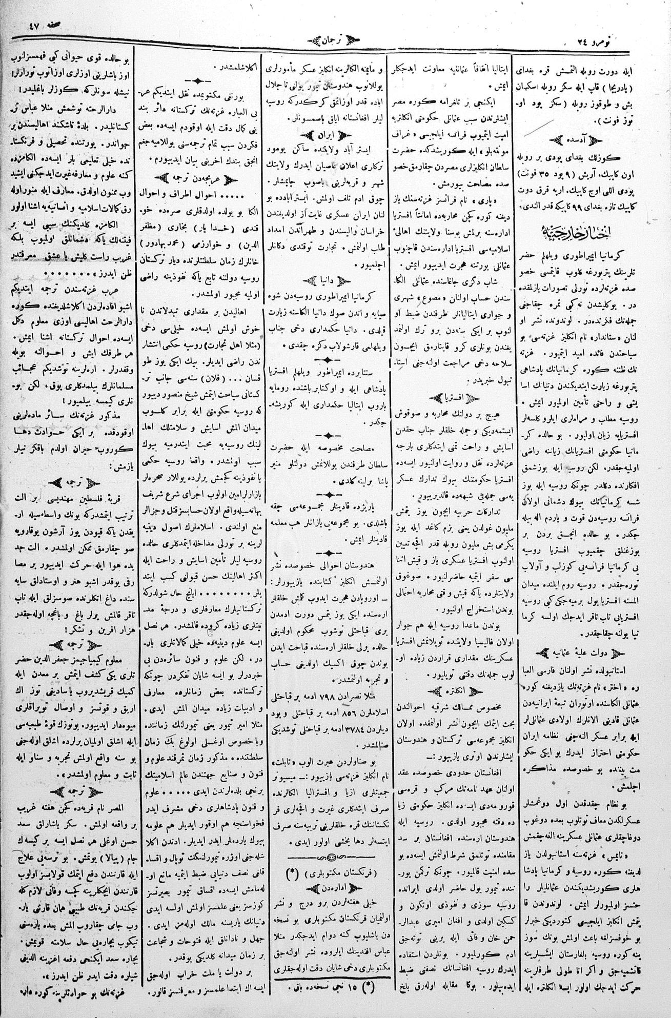 The name of the newspaper changed to Tercüman-ı Ahval-i Zaman in 1905. In 1909, it started to be published under its first name, Tercüman.