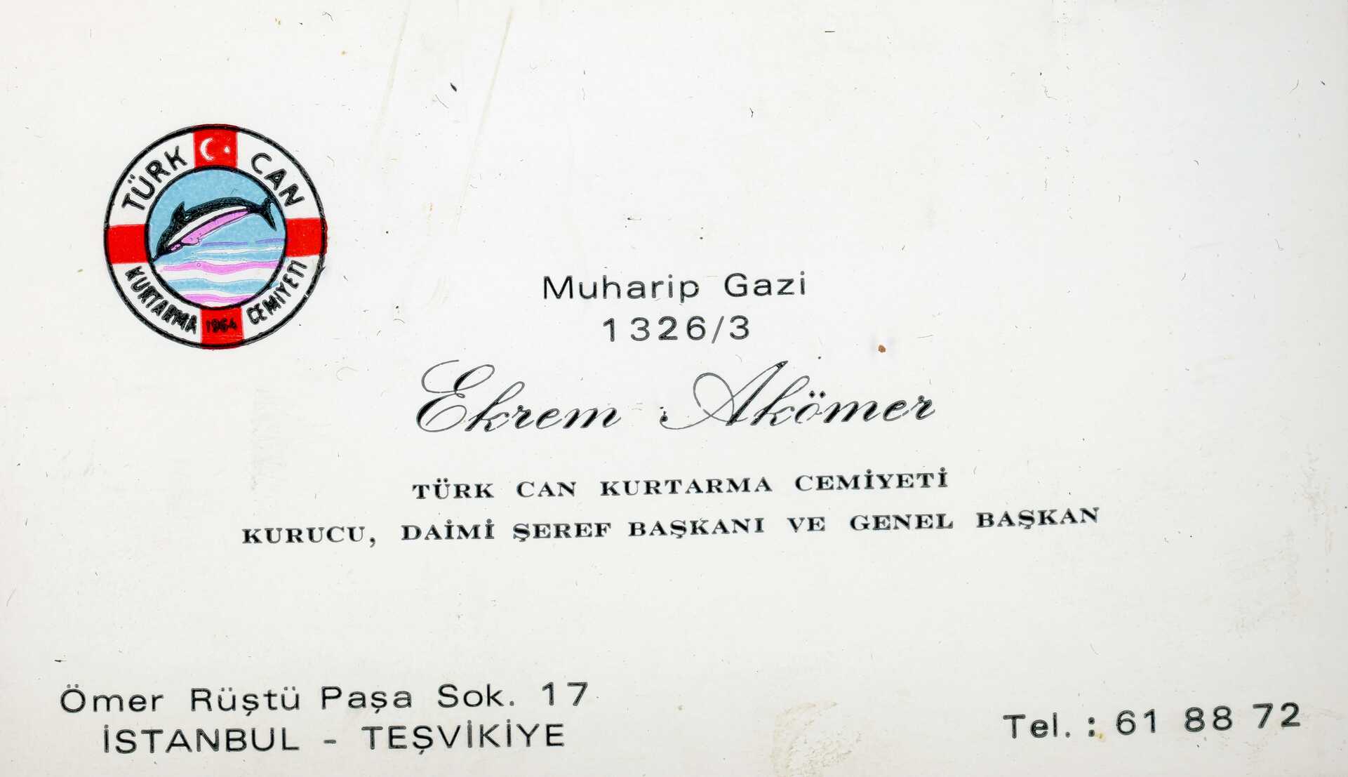 Ekrem Rüştü Akömer’in Türk Cankurtarma Cemiyeti Kurucu, Daimi Şeref Başkanı ve Genel Başkanı olduğu zamanki kartviziti