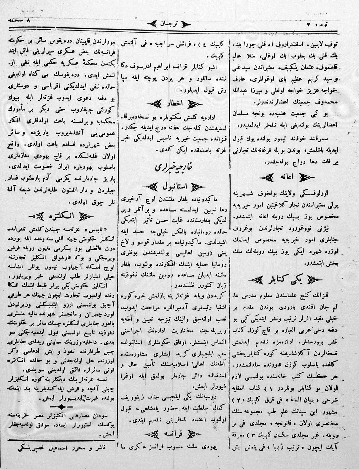 The name of the newspaper changed to Tercüman-ı Ahval-i Zaman in 1905. In 1909, it started to be published under its first name, Tercüman.