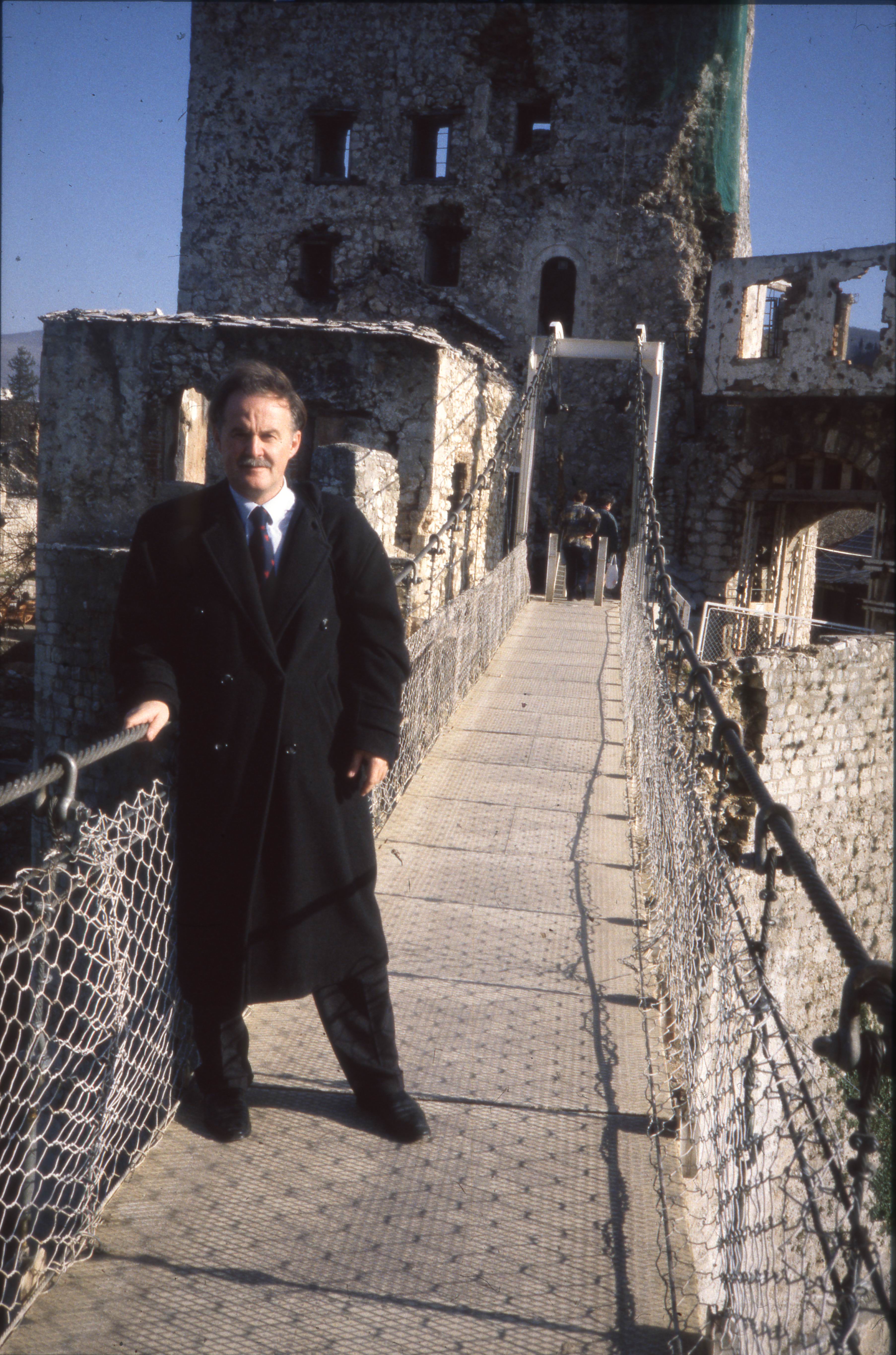 Amir Pašić on the temporary bridge built to replace the Old Bridge in Mostar