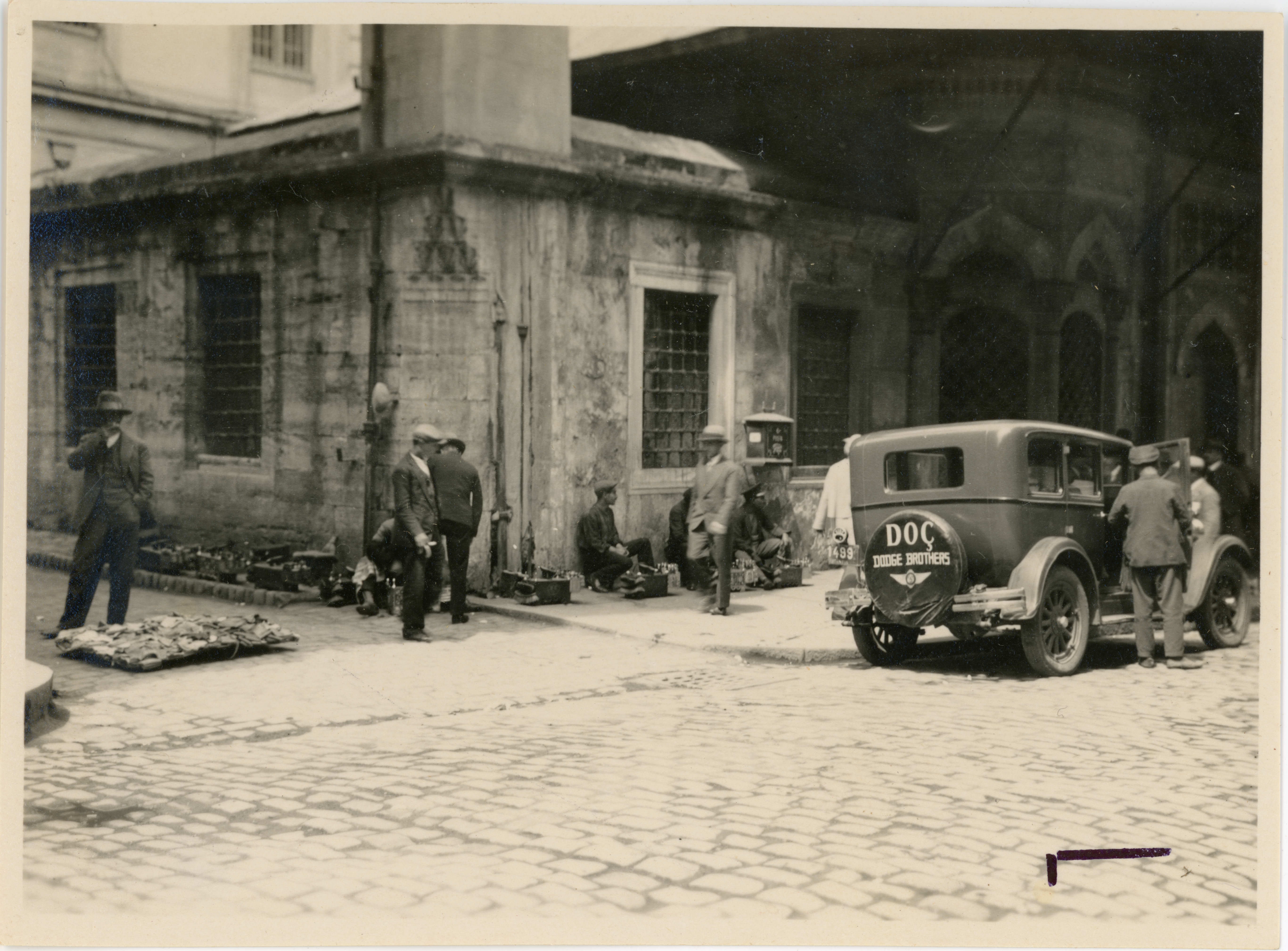 Yeni Camii arkasında sokak satıcıları, ayakkabı boyacıları ve bir Dodge marka araba