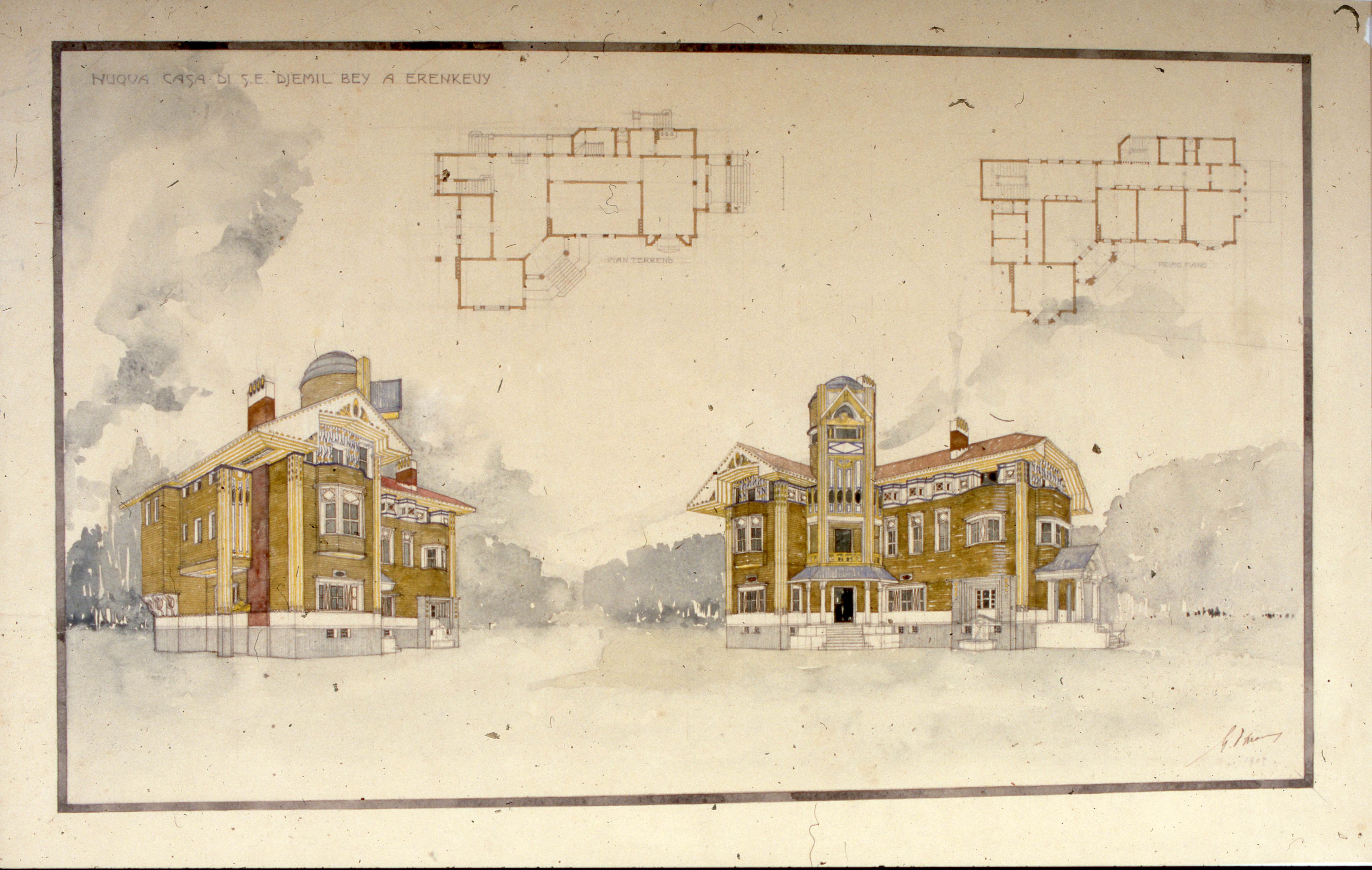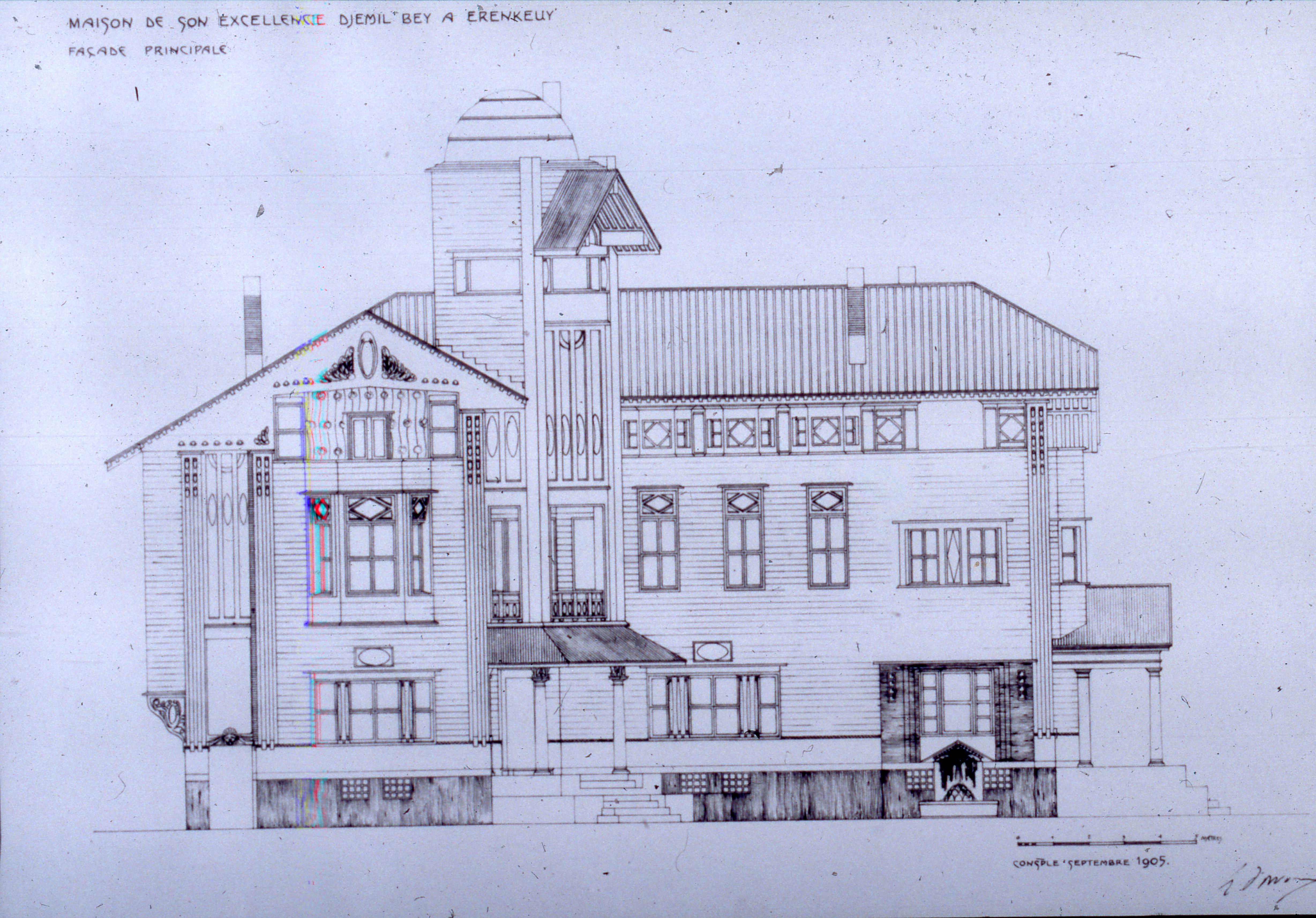 General plan and main facade of Cemil Bey House in Erenköy drawn by Raimondo D'Aronco