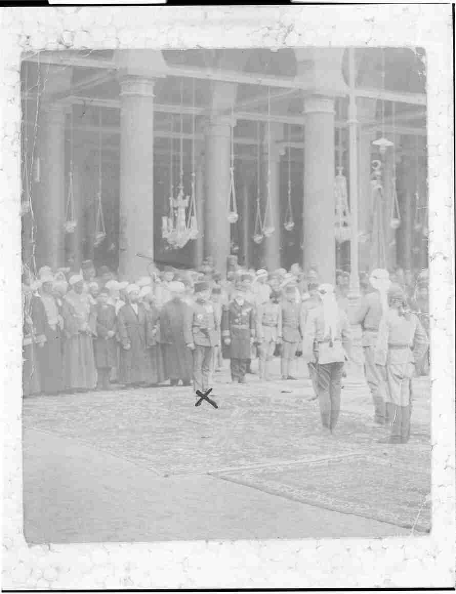 Fahreddin Pasha, with the military and town dignitaries in attendance, hanging a decoration on a regimental flag for bravery shown at a ceremony held in al-Haram al-Nabawi's courtyard.