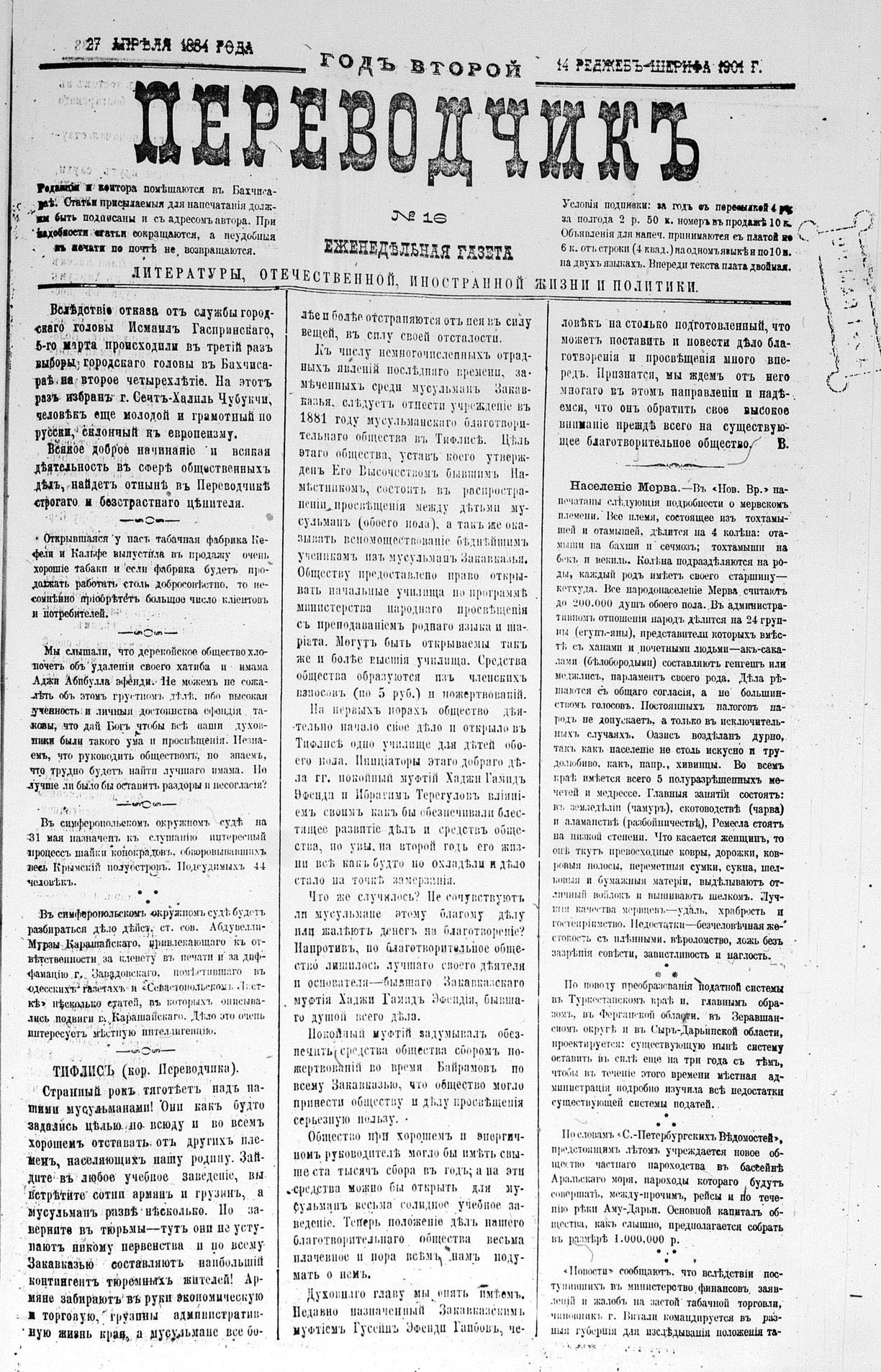 Tercüman, 27 April 1884 Year 2 No 16