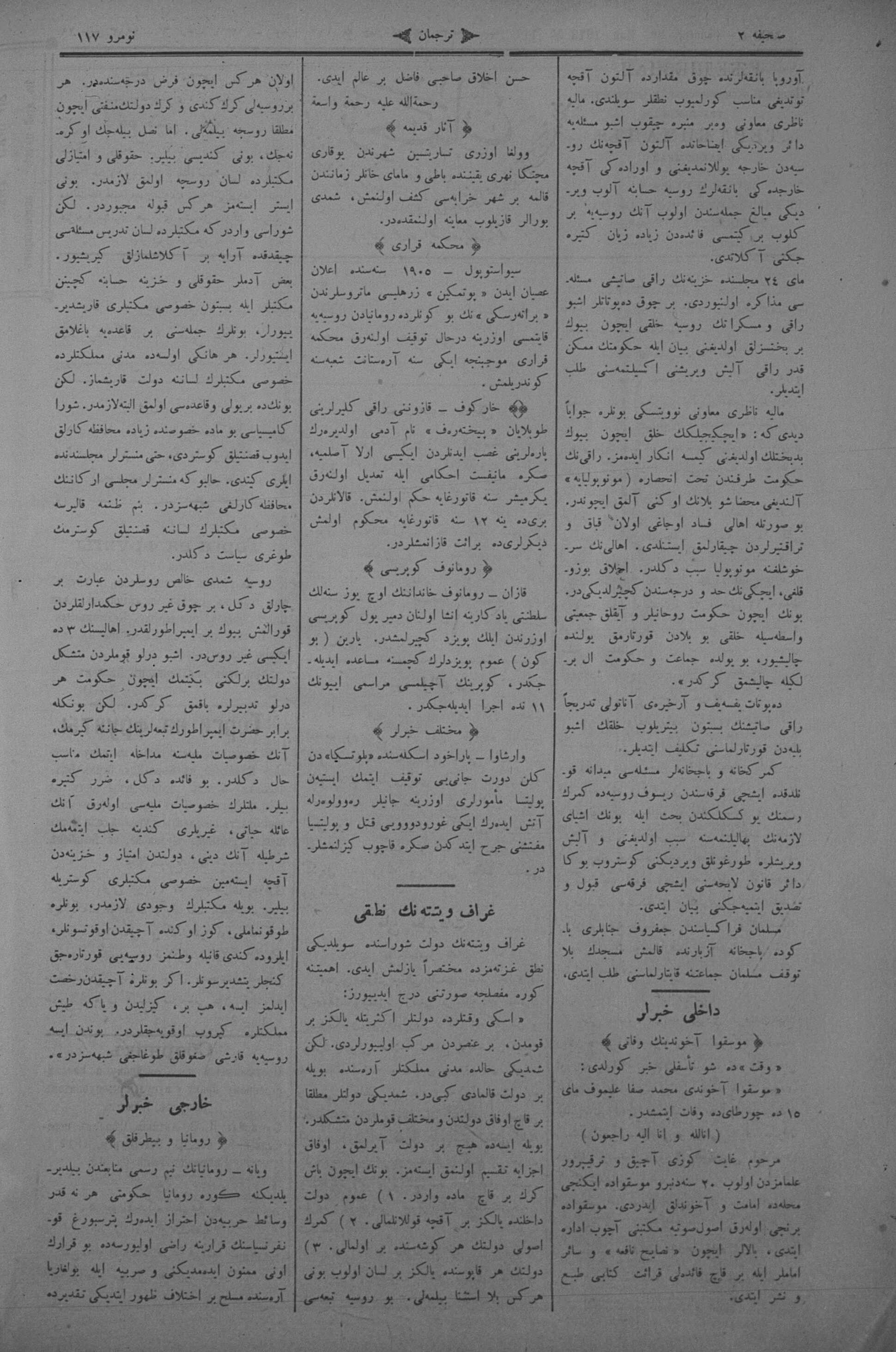 The name of the newspaper changed to Tercüman-ı Ahval-i Zaman in 1905. In 1909, it started to be published under its first name, Tercüman.