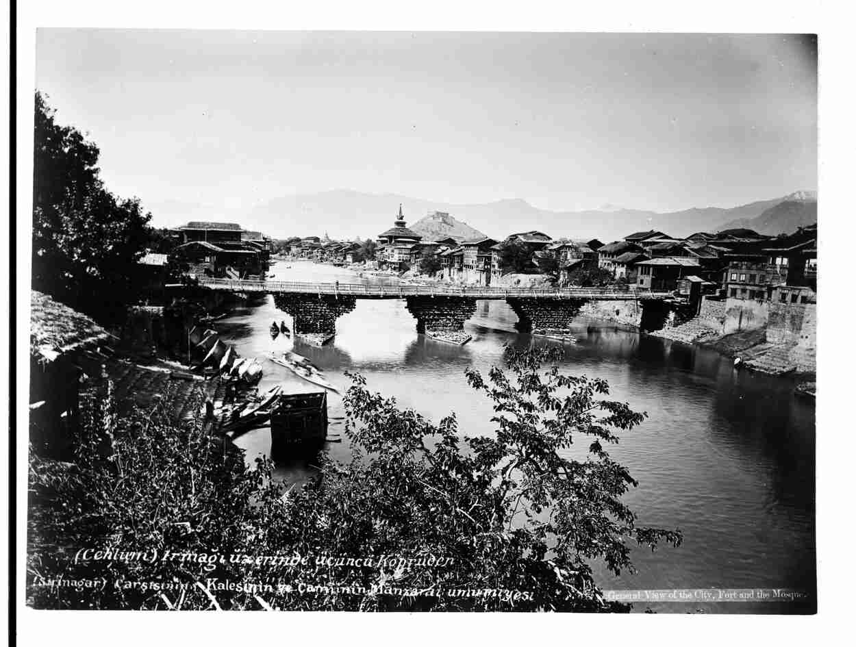 Chelum Irmağı üzerinde üçüncü köprüden Srinagar çarşısının, kalesinin ve camiinin manzara-i umumiyesi