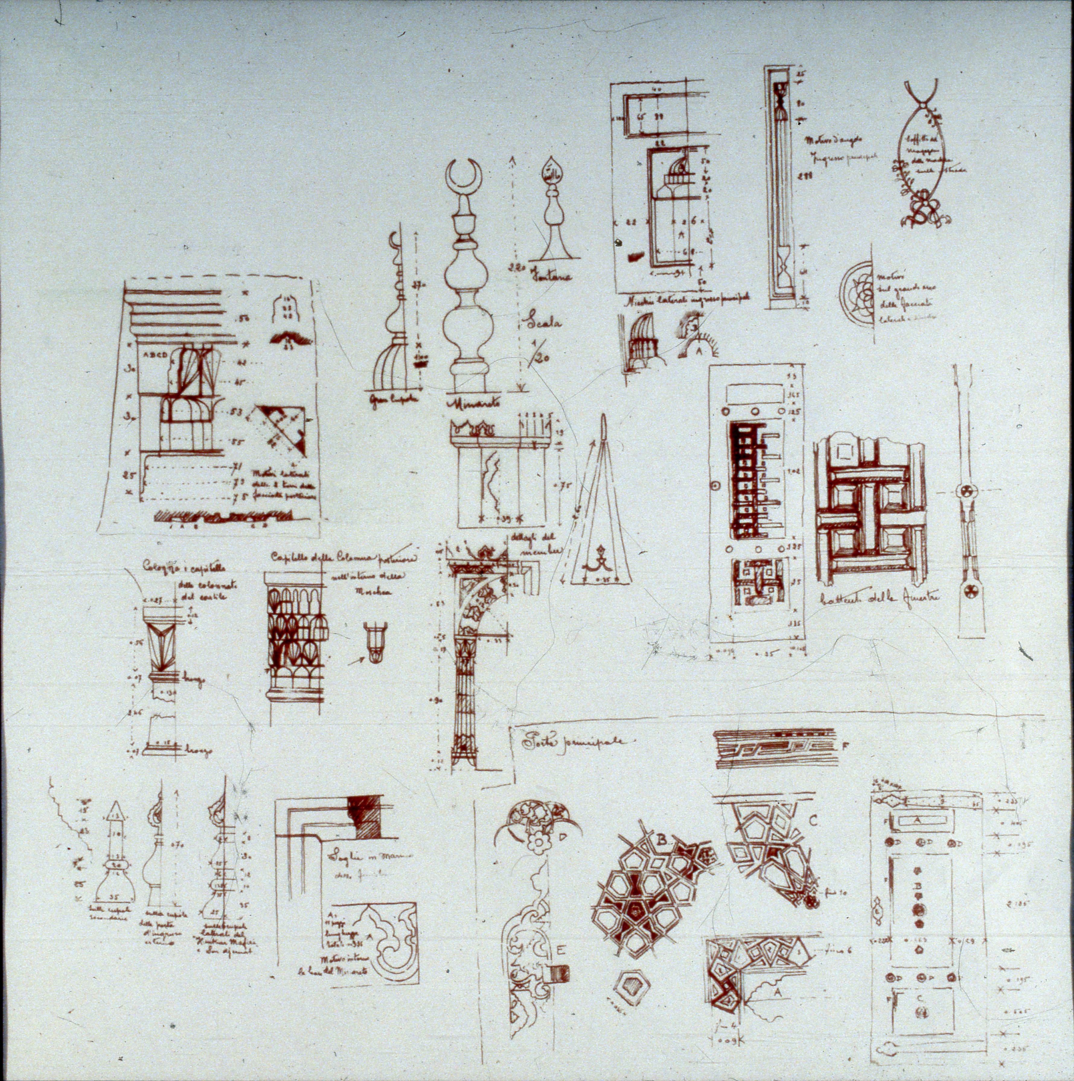 Decorative elements for the restoration of Mihrimah Sultan Mosque in Edirnekapı drawn by Raimondo D'Aronco