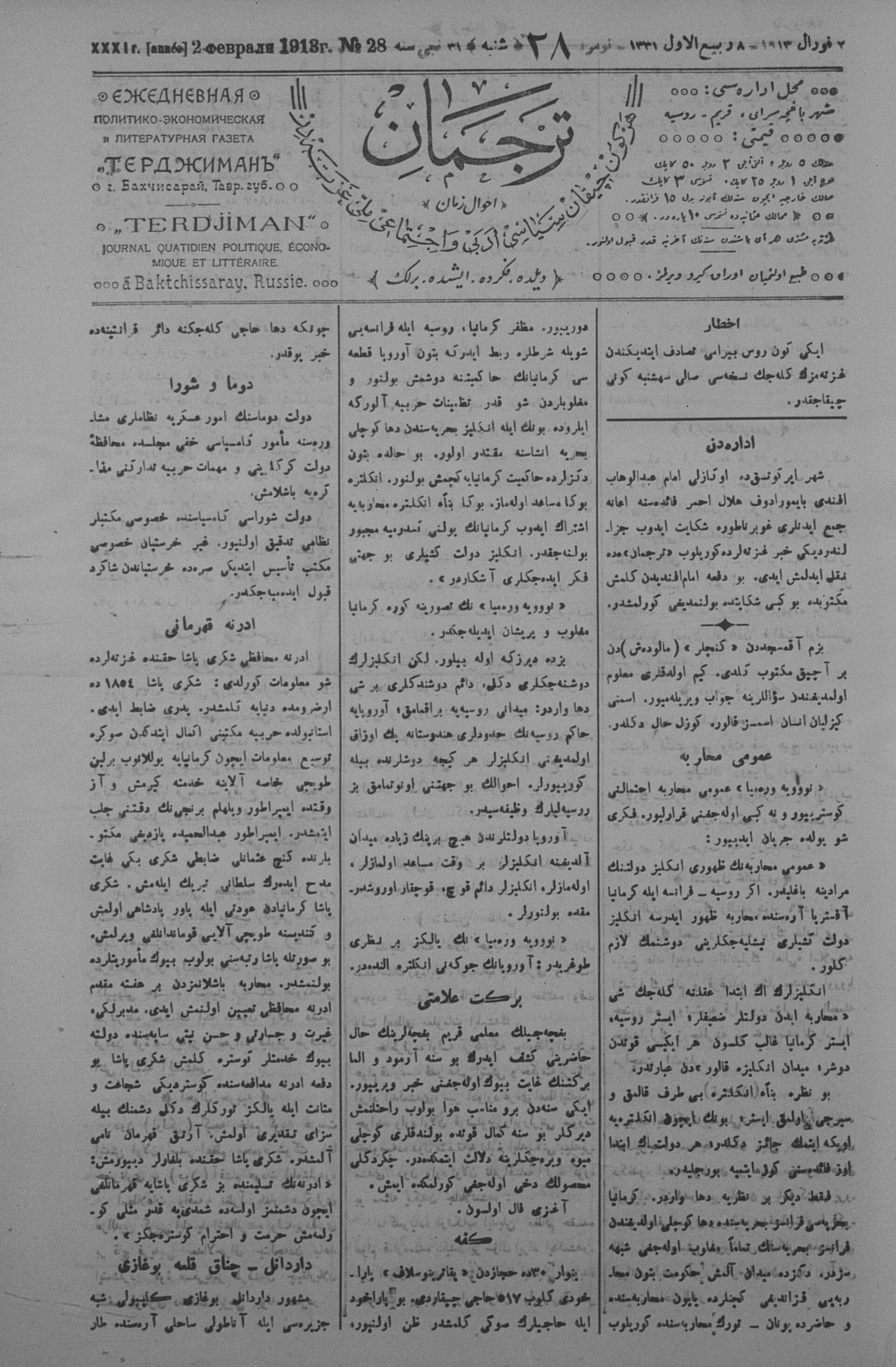 Tercüman, 02 February 1913 Year 31 No 28