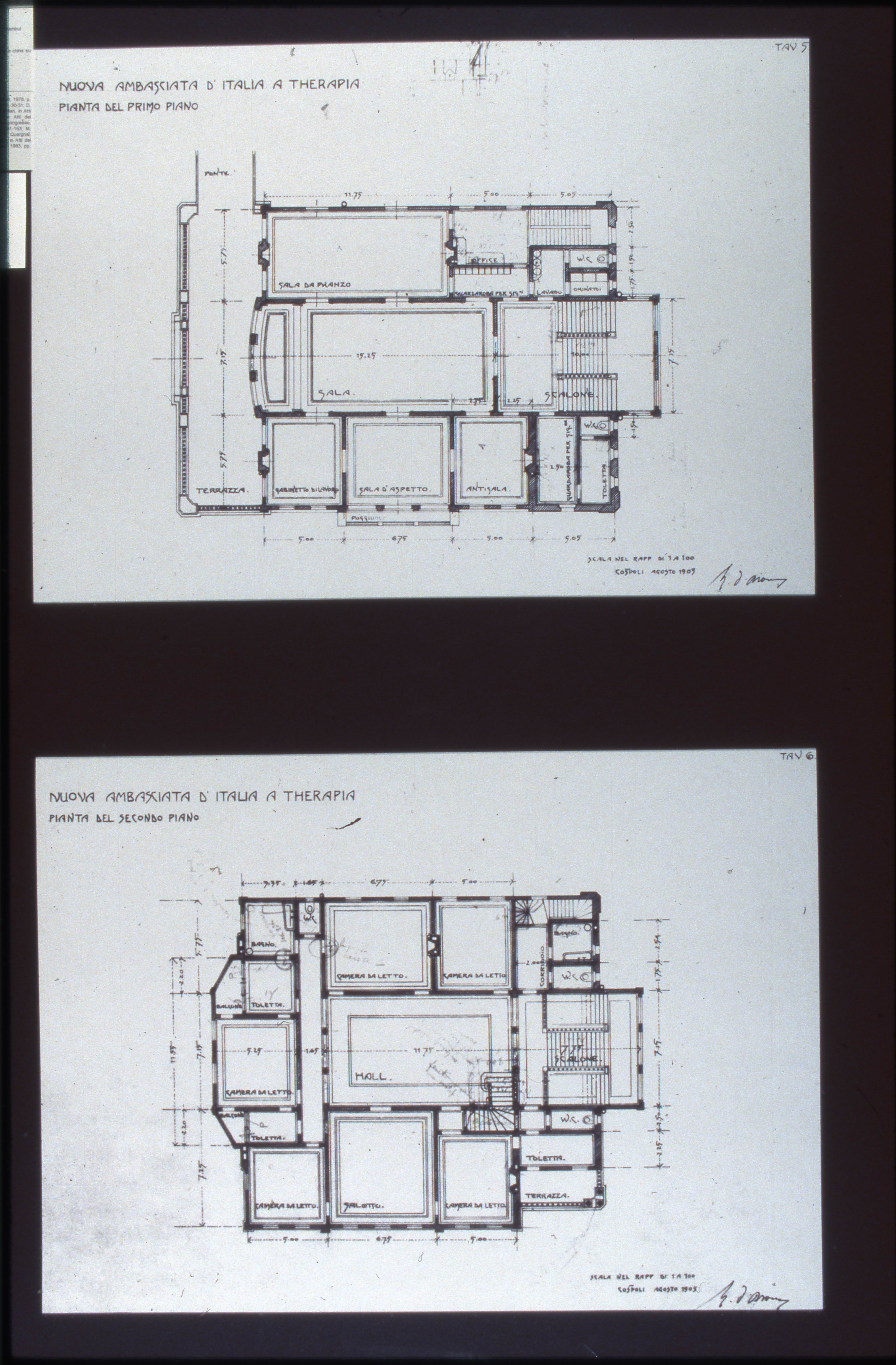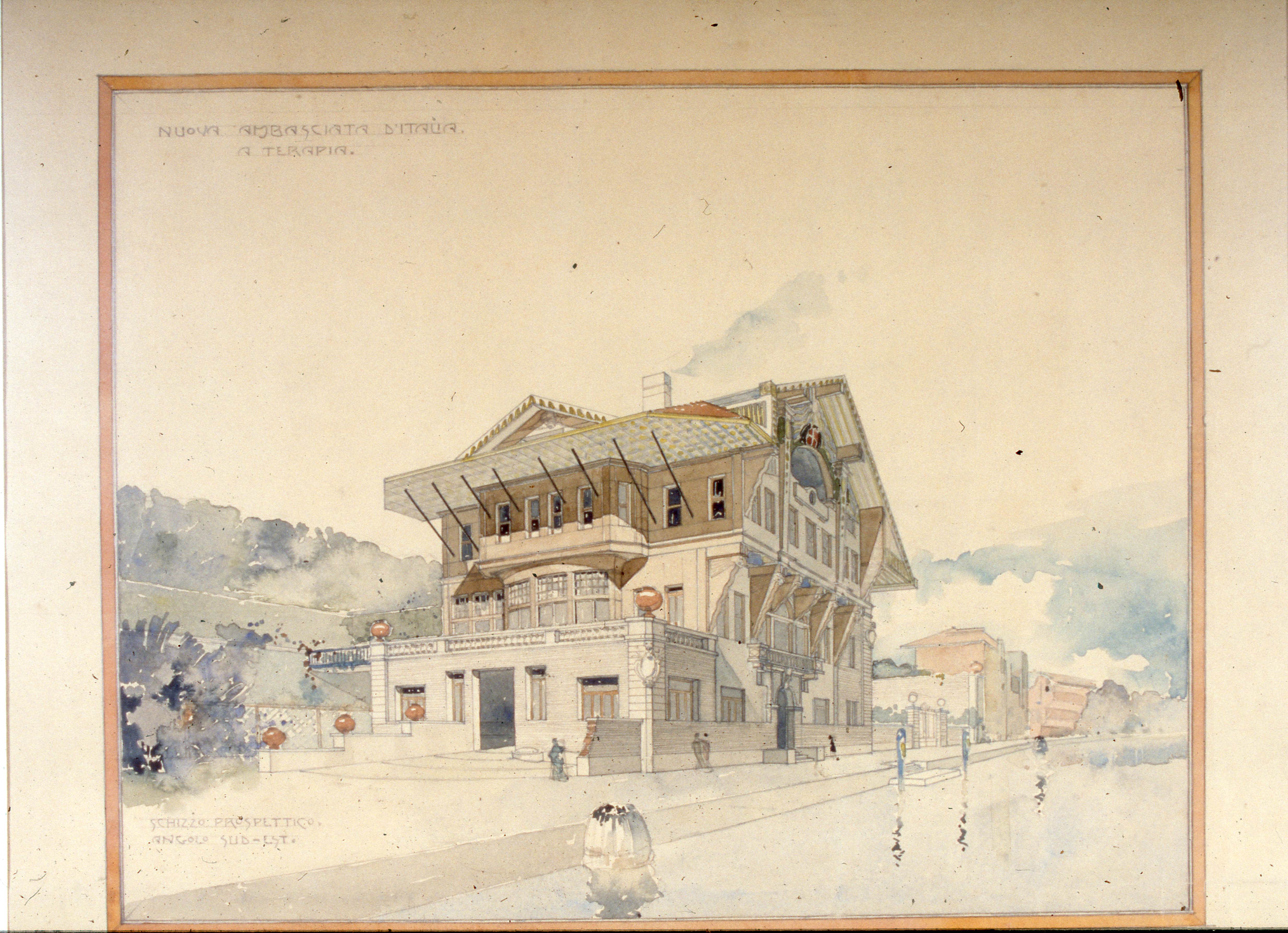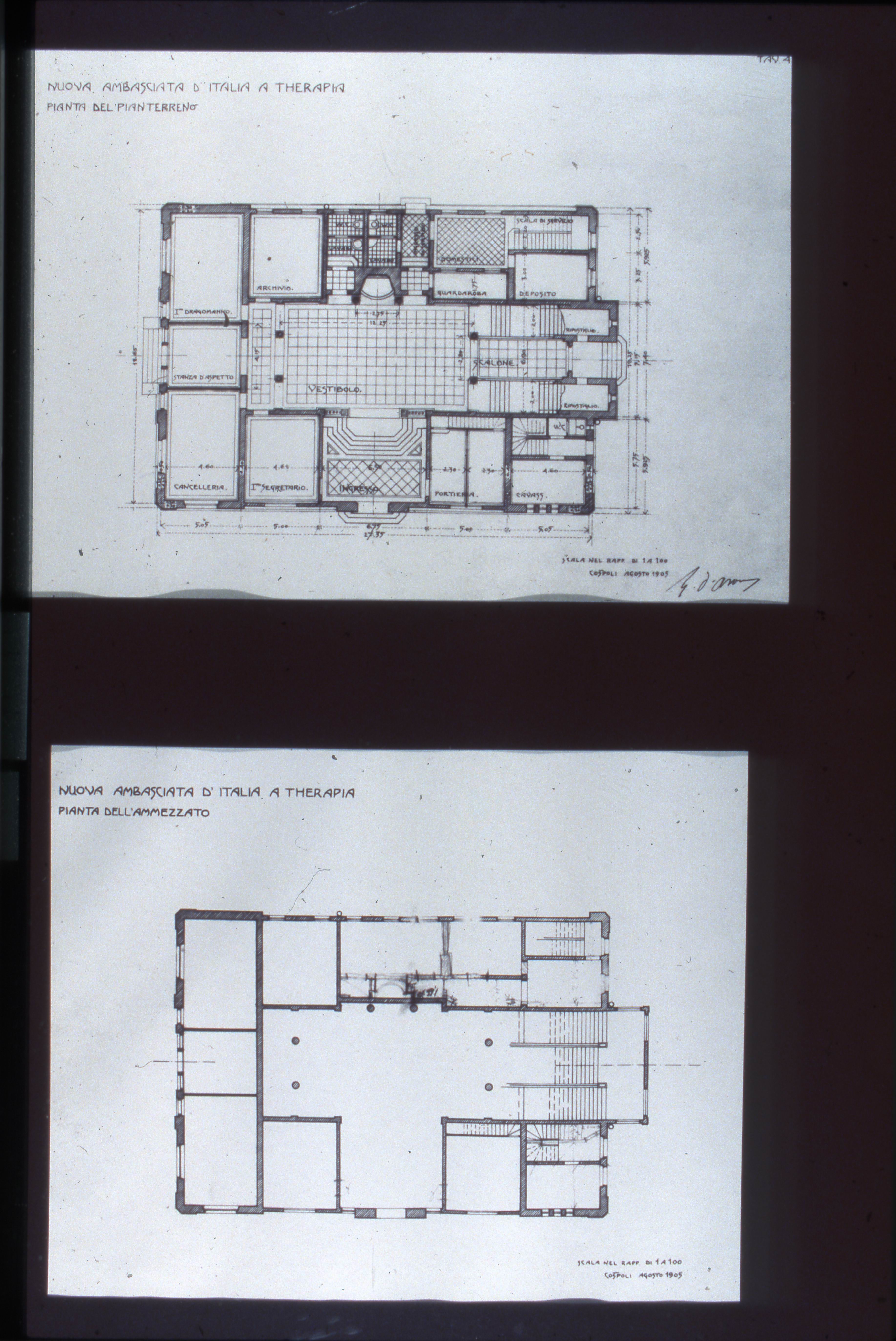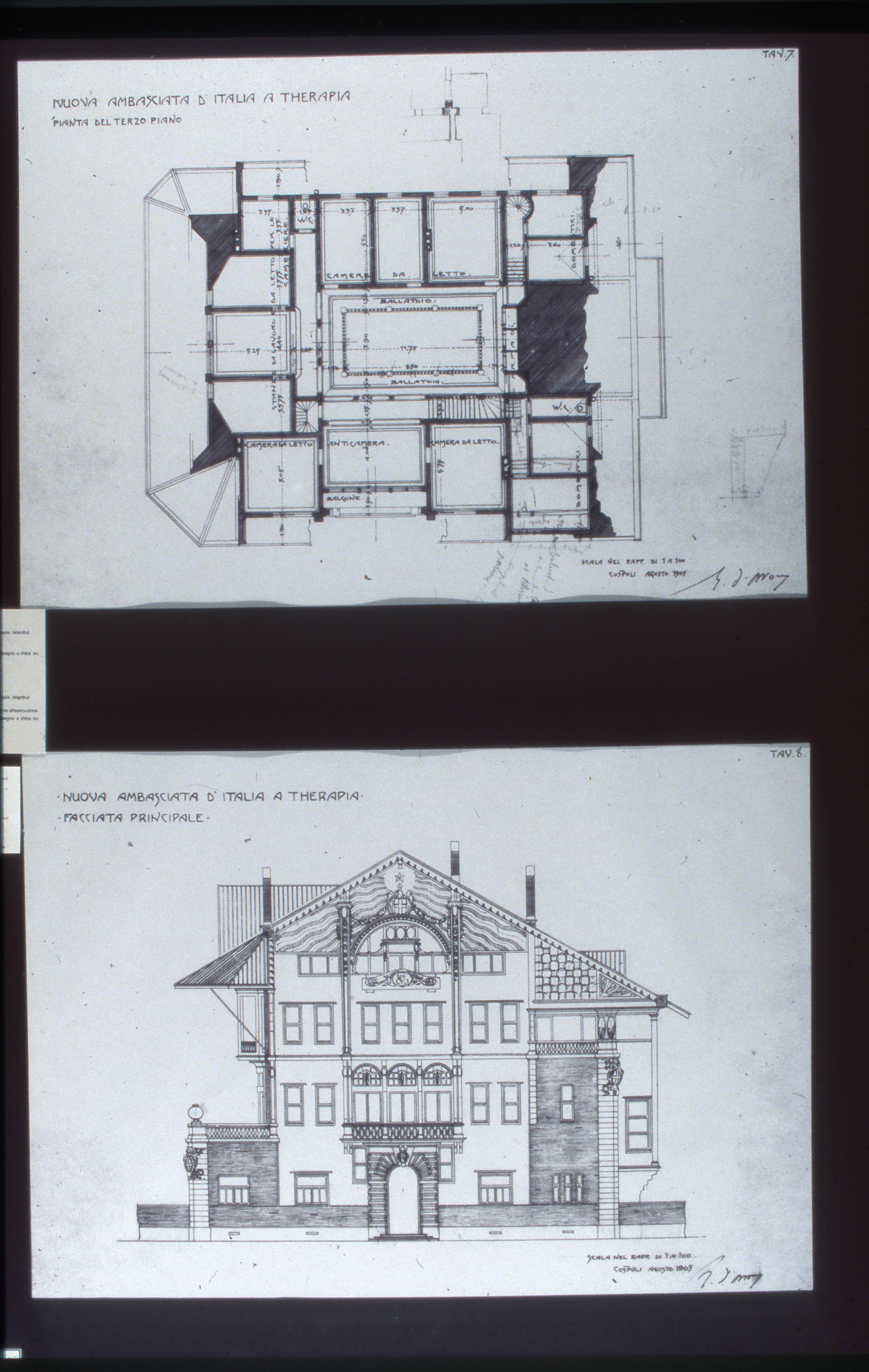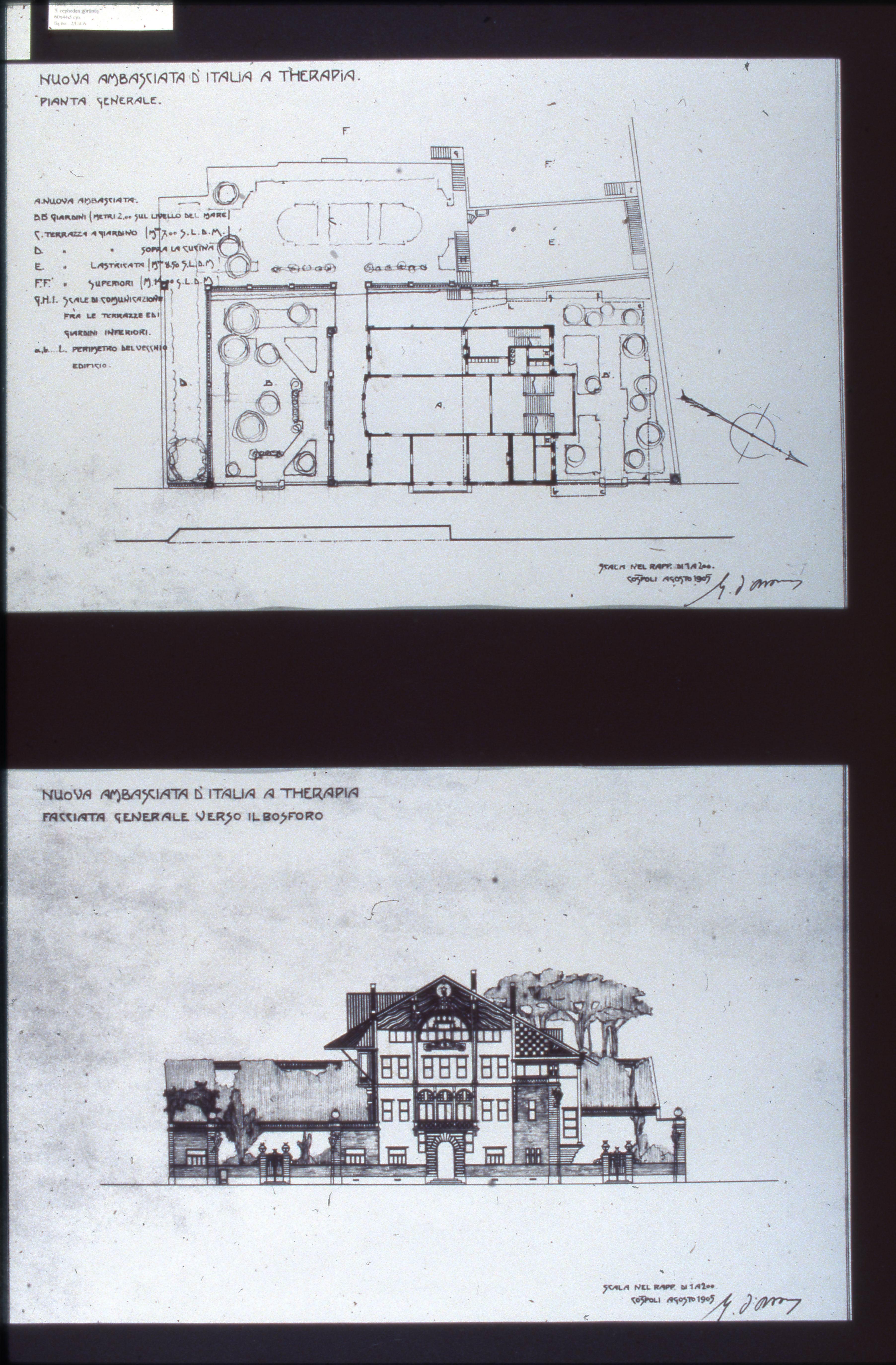Floor plans and views of the main façade of the Italian Embassy in Tarabya drawn by Raimondo D'Aronco