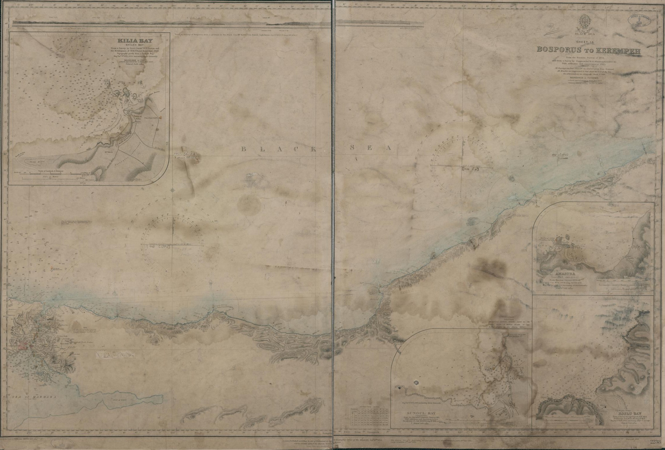 With: Amastra: ancient Amastris, Scale 1:29,150.- Koslu Bay, Scale 1:16,200.- Sungul Bay: Zonguldak, Scale 1:12,100.- Kilia Bay: Shileh Bay, Scale 1:12,500.